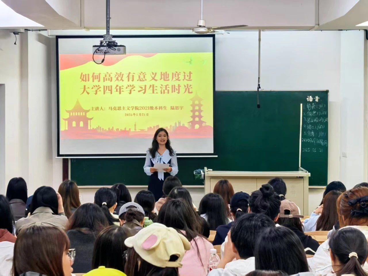为助力2024级同学明晰大学生活规划方向,做好生涯蓝图设计,我院于5月21日在田家炳教育书院10126教室举办优秀毕业生经验分享会,邀请2021级优秀学生干部代表陆思宇围绕大学成长路径、生涯系统规划等内容分享经验,2024级全体同学参加 。