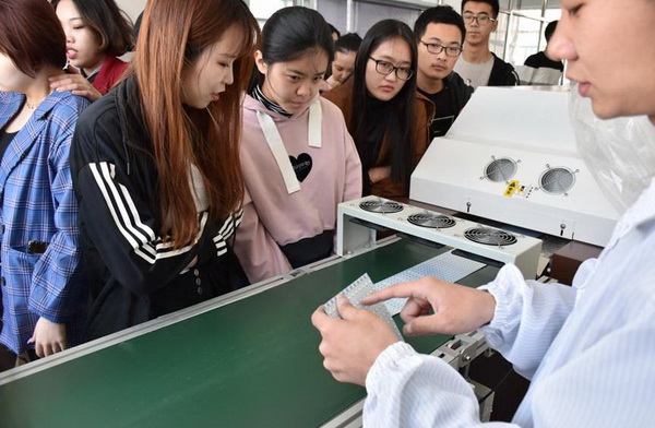 在大学生创业园,通过创业园区的专业人员介绍,我院学生在参观LED灯制作过程的同时,也认识到了能将一种电能转化为可见光的固态的半导体器件,再由器件直接把电转化为光的神奇。在参观体验环节,同学们产生了极大的好奇心并迫不及待的投身于参与制作环节体验。