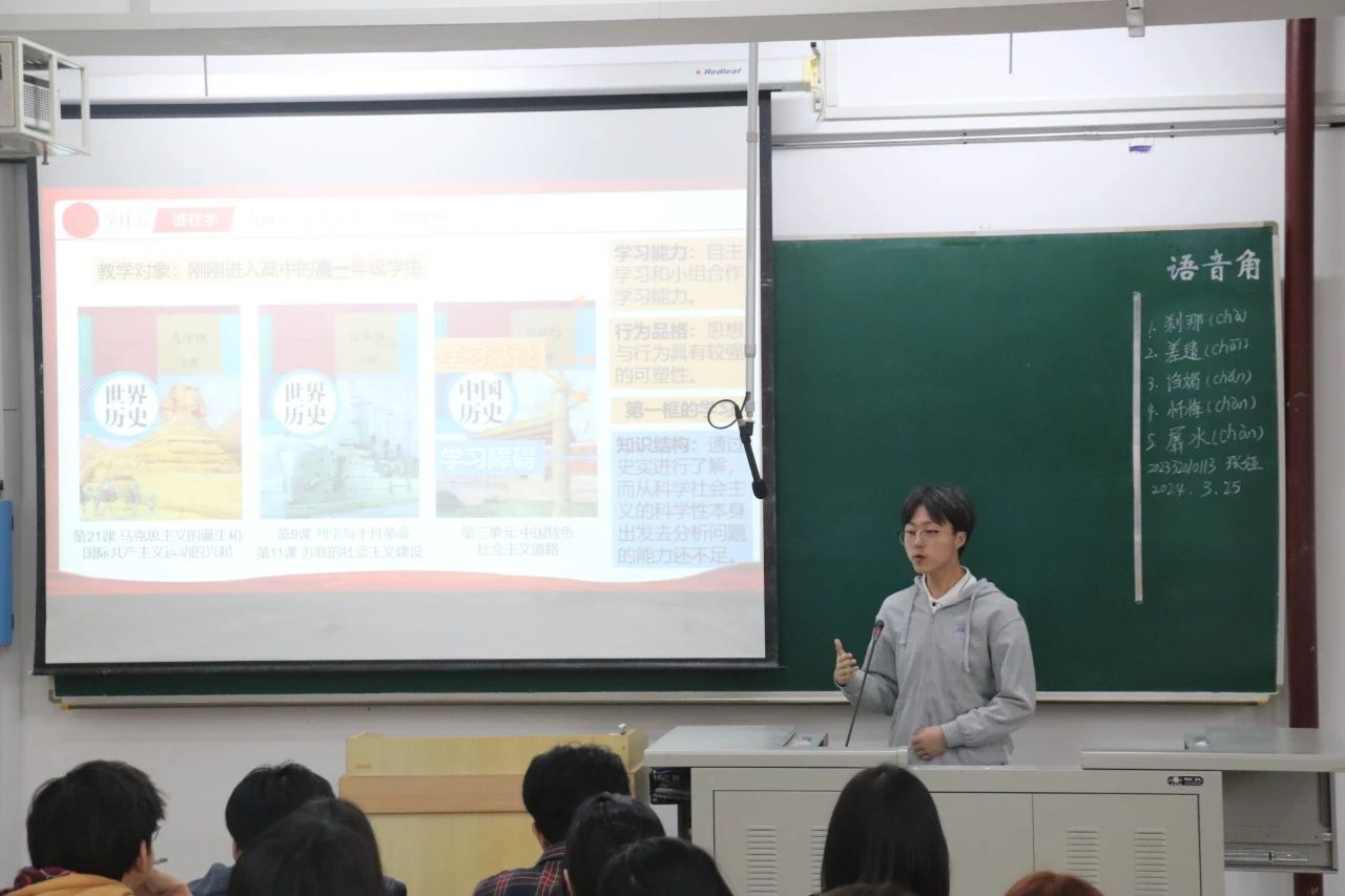 3月25日下午至26日上午进行小组说课展示和高中政治新课标的研读及探讨,加深同学们对新课标的理解与认识,并充分将所学知识运用至说课环节。通过借鉴优秀教师的说课与讲课经验,有助于我院学子塑造扎实的学术基础、精进教学技艺,展现出卓越自我的精神风貌。