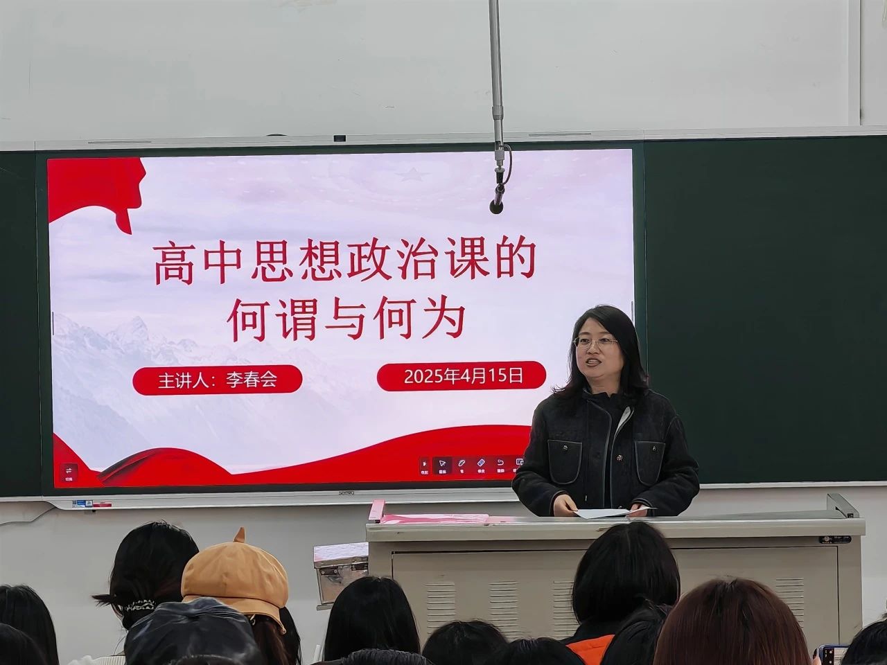 讲座伊始,李春会以“思政课是什么‘课’?”为出发点,从思想引领、价值引领、方向引领、科学思维引领、思维方向引领五个角度,简明扼要地阐述思政课的本质属性。