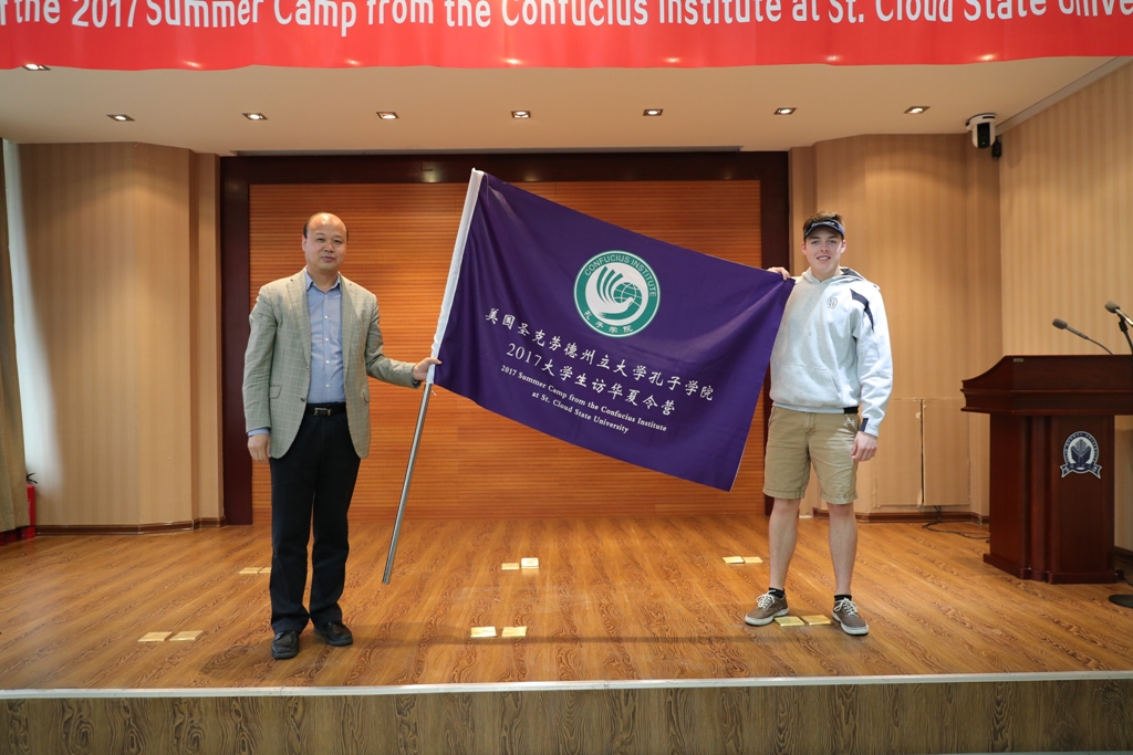 欢迎仪式上,胡仁友、杨景海、Kathy Johnson博士分别致辞。胡仁友代表省教育厅、吉林汉办向营员授旗。