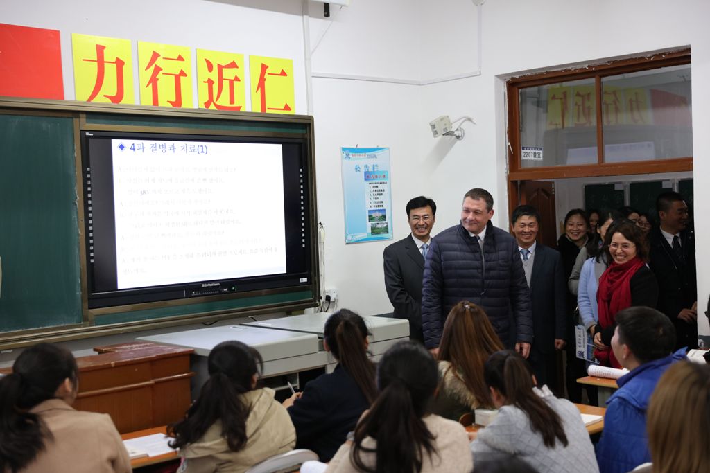 会谈结束后,在许才山和杨景海的陪同下,马克·拉米先生一行参观了bat365外国语学院,并与学生进行了互动交流。
