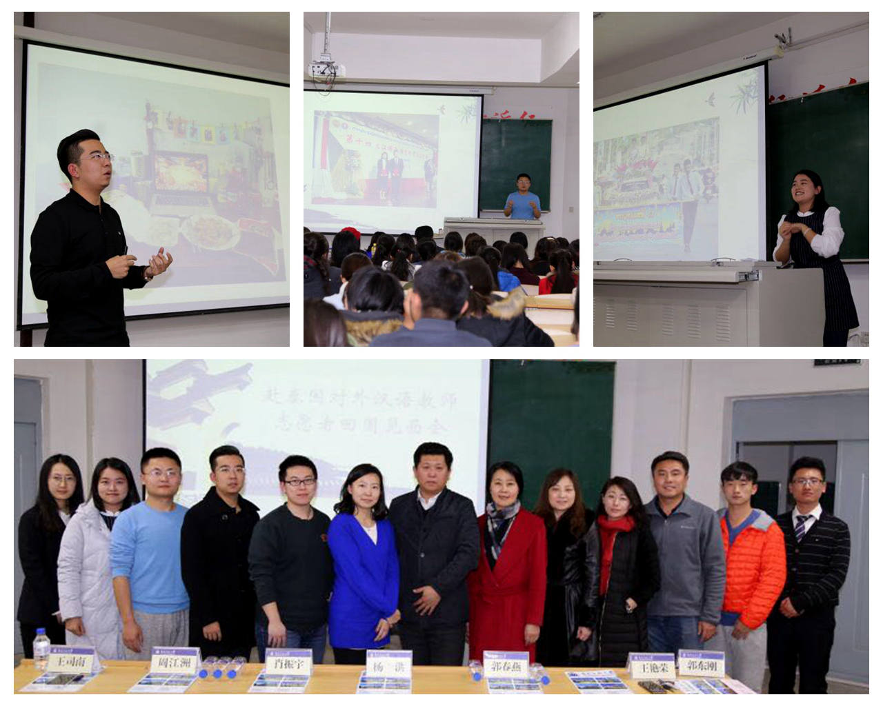 3月11日,2016年赴泰国汉语教师志愿者回国见面会在bat365举行。本次见面会由吉林省对外汉语教学培训中心(吉林汉办)主办,bat365承办。吉林汉办党支部书记杨洪一行4人和校长杨景海出席本次活动,文学院、国际文化交流学院、国际交流与合作处相关负责人、教师参加了见面会活动。