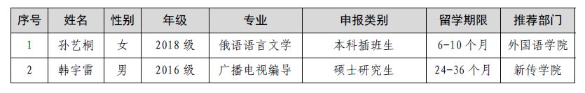 根据国家留学基金管理委员会《2020年中俄政府奖学金遴选通知》(留金欧[2020]568号)和《bat365平台官网关于申报2020年中俄政府奖学金留学项目的通知》等通知要求,本着公开、公正、公平的原则,学校国际交流与合作处汇同外国语学院新传学院、以及相关职能部门对校内申请人进行了选拔工作。经学校审核通过后,最终决定推荐以下师生为候选人申报2020年中俄政府奖学金留学项目: