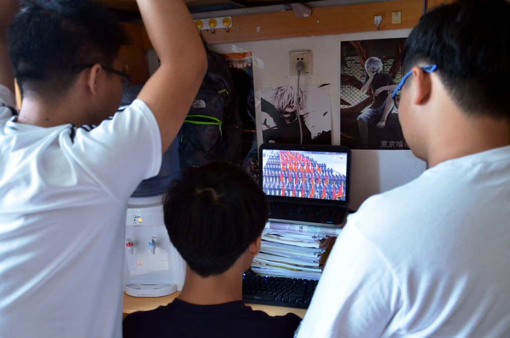 在第一学生食堂,六台电视机同时直播中国人民抗日战争暨世界反法西斯战争胜利70周年纪念大会,数百名师生在此集中观看。气势恢宏的阅兵式让师生们热血沸腾,他们用一次又一次热烈的掌声来表达此时激动的心情。更多的师生则通过新媒体在网上、手机上收看了阅兵式,虽然观看的地点不同,但心情却是一致的。在收看直播的同时,师生们将难以抑制的激动发送到朋友圈,大家纷纷感叹“今天被祖国刷屏!”