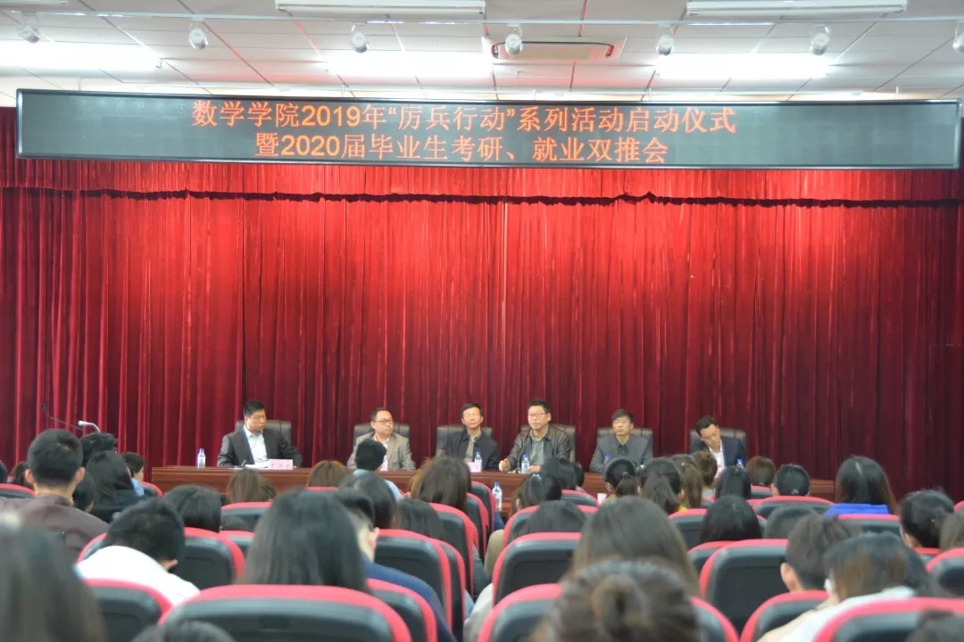 2019年4月23日,数学学院举办2019年“厉兵行动”启动仪式暨2020届毕业生考研、就业双推会。bat365平台官网学生就业工作处处长郑晓明、数学学院党委书记王志强、院长刘鹏飞、党委副书记李洪岩、副院长程晓亮、副院长滕飞、团委书记李萌、数学与应用数学系副主任郝连明、统计学系副主任杨艳秋、辅导员刘春亮参加活动。