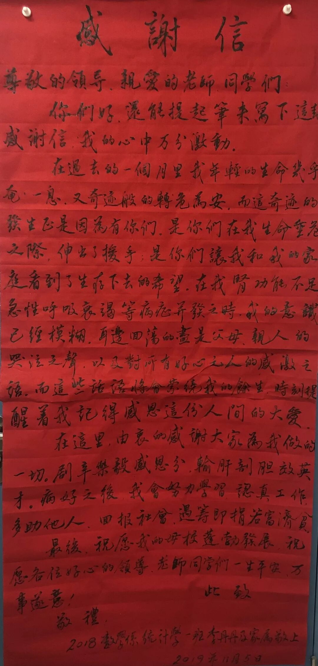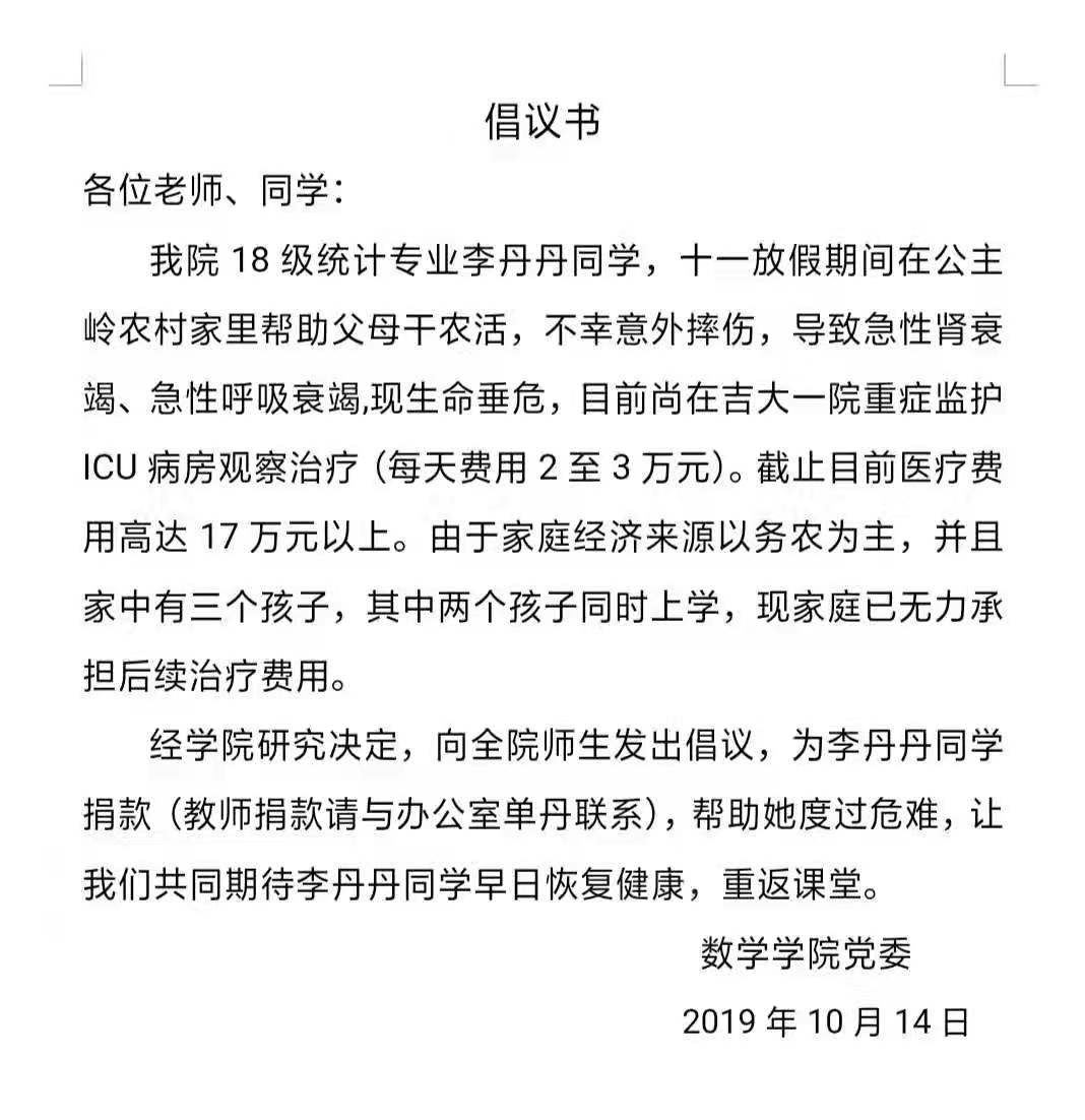 “命悬一线,与病魔硬磕的九天九夜。” “全家的希望与骄傲,花儿一样的年纪,高额的手术费用,逼近绝望的病情。” 治,前景未卜、无力承担;不治,至亲骨肉、身心何安?这个需要同时抚养三个孩子的农村家庭,对每天近三万元的治疗费用真的是束手无策,而且,不知道还会在重症呆多久。无奈无措之际,李丹丹的家人向bat365平台官网数学学院发出了求助,此时,正是学校开展“不忘初心、牢记使命”主题教育期间,数学学院在得知李丹丹最新病情和家庭实情之后,即刻召开学院党政联席会,第一时间以数学学院党委的名义向全院师生发出了“为2018级统计学专业李丹丹捐款”的倡议,积极转发“水滴筹”,同时向学校领导和职能部门汇报最新近况。一时间,李丹丹的病情瞬间牵动着“吉师师生”“吉师校友”的心,学校领导、教师、学生,领导的同学,教师的家属,学生的家长以及社会爱心人士,纷纷献出爱心,以小水滴聚大爱。