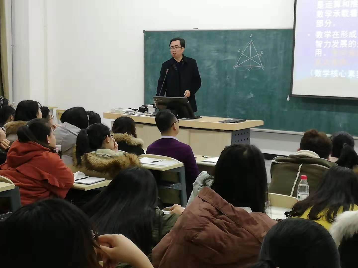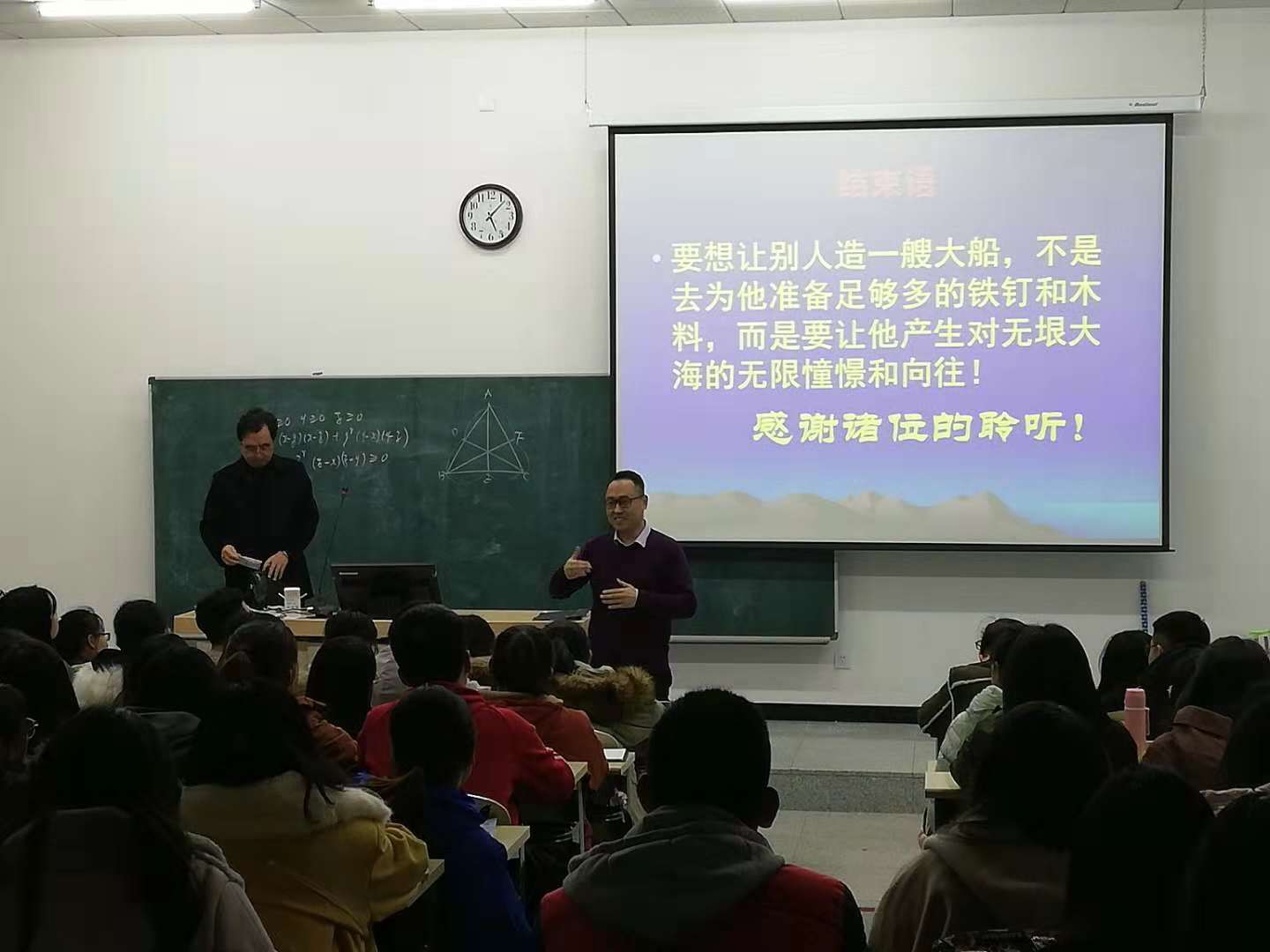 2018年11月19日,四平市第一高级中学教务主任闫岐老师为我院师生做了题为“新形式下的数学课堂教学”的报告。报告以详实的案例出发,深入浅出的讲解了高中数学核心素养与数学知识体系的构建以及教学实践问题。闫岐老师拥有多年一线教学经验,在教师教育,课堂教学实践,数学竞赛等方面经验丰富,在报告中他深入浅出,用大量的实践案例介绍高中数学教学内容。开拓了学生们的视野,增长了相关知识。