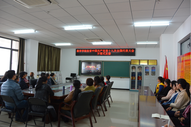 中国共产党第十九次全国代表大会于2017年10月18日在北京隆重开幕。按照学校党委要求,数学学院党委通过电视、网络直播,采取集中及个人自行收看等多种形式,认真组织师生收听收看党的十九大开幕会。