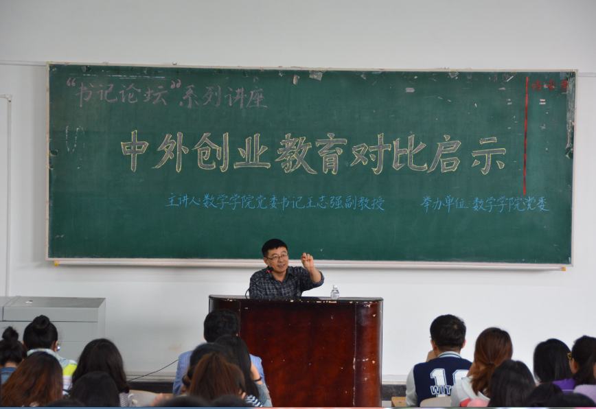 2016年5月25日下午14:00,数学学院党委举办了“书记论坛”系列讲座活动,由学院党委书记、国家级职业指导师王志强副教授为2013级学生做了“中外创业教育对比与启示”的报告。