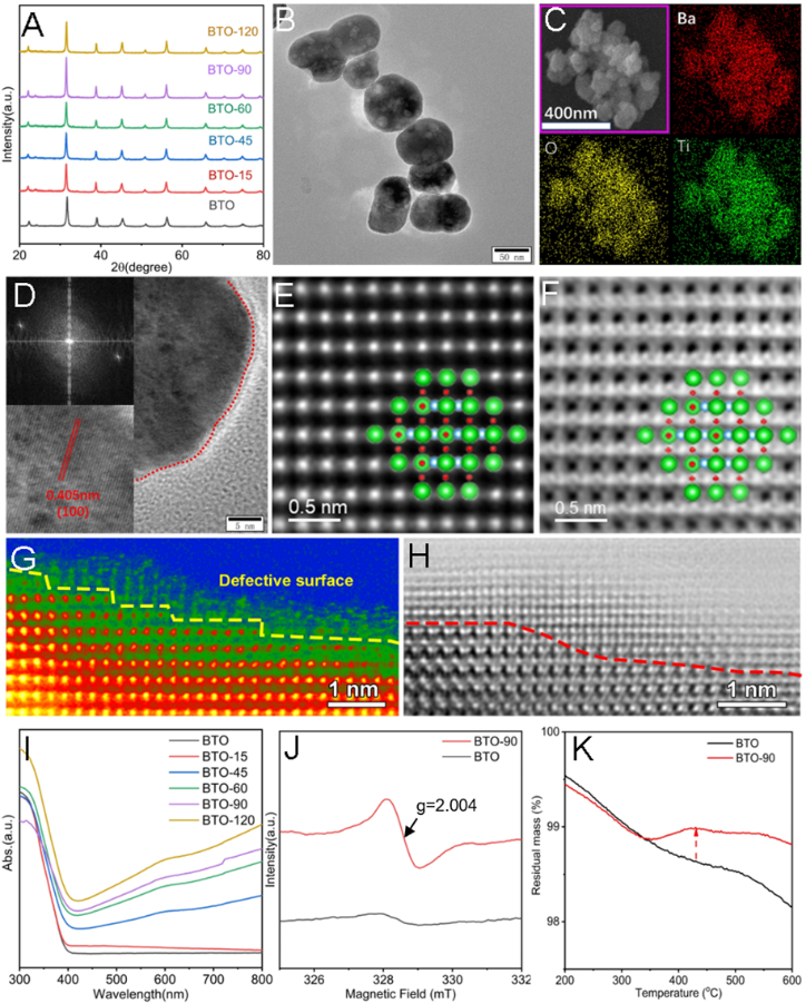 图1.Ov-BTO的材料结构相关形貌及微观表征