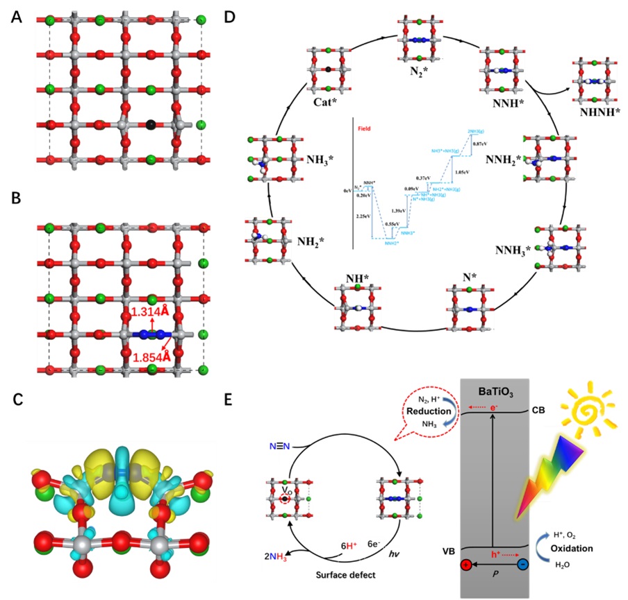 该研究工作以典型的钙钛矿型极化材料钛酸钡为研究对象,采用具有普适性的硼氢化钠热还原法,制备了富含有表面氧缺陷的钛酸钡(Ov-BTO)。在不改变材料的形貌、晶体结构与本征能带结构的情况下,提高了内建电场对光生电荷的分离效率,并显著增强氮气在材料表面的吸附与活化,并用于磁场辅助下的高效光催化氮还原合成氨。