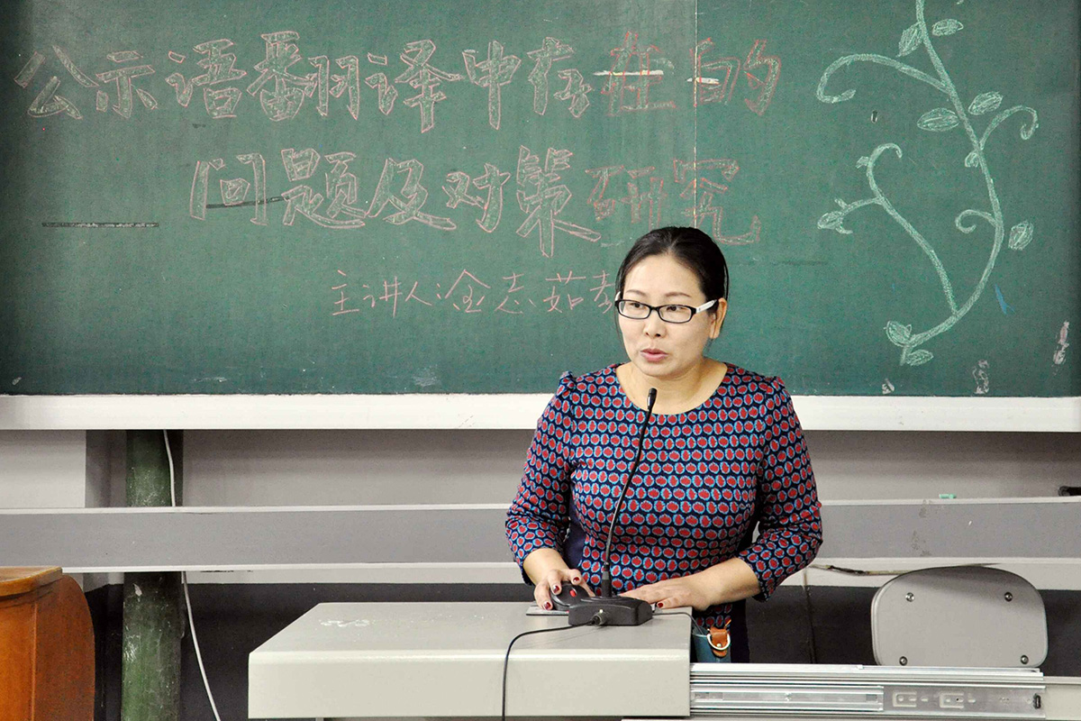金志茹教授本次讲座的主题为“公示语翻译中存在的问题及对策研究”。金教授从“公示语的概念”、“公示语的功能”、“公示语翻译中存在的问题”、“公示语翻译的原则及技巧”等方面阐述和分析了目前我国公示语翻译中仍然存在的问题,提出了解决的对策;并就同学的未来发展介绍了翻译硕士考研信息。