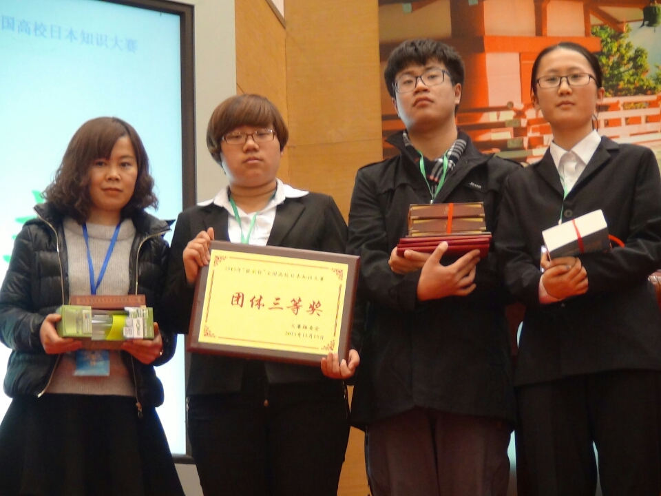 2015年11月14日至15日,由日本科学协会和吉林大学主办的“2015年笹川杯全国高校日本知识大赛”在吉林大学举行,北京大学、南京大学、东北师范大学、武汉大学等100多所高校参加此次大赛。经过激烈角逐,我院日语专业2013级杨闫晓楠、李林珊和2014级段博文三名同学组成的参赛团队,荣获团体三等奖,指导教师刘丽芳荣获“优秀指导教师奖”。