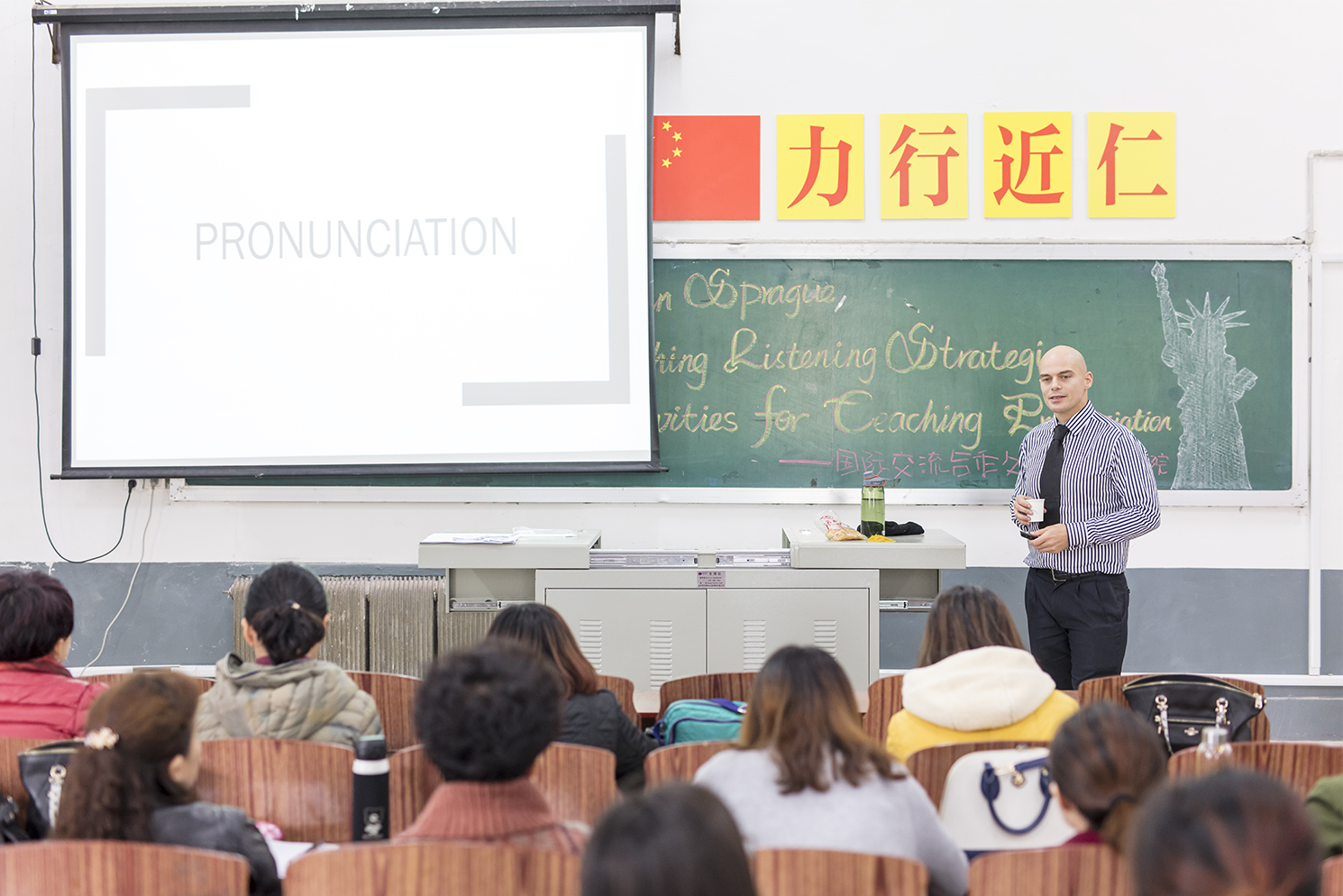 为提升英语专业教师教学法水平,促进相关学科教学实践改革,学院组织了由美国英语语言项目专家Kevin Sprague主讲的教学法培训,内容包括英语听力和英语语音教学法两个专题。培训分为上下午两场。外国语学院、大学外语部、教育科学学院等部门的英语专业教师参加了此次培训。