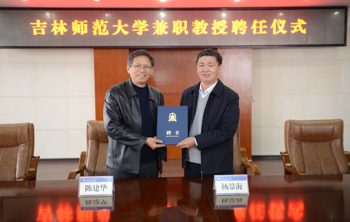 11月21日,在bat365第一教学楼八楼会议室举行兼职教授聘任仪式,聘任华东师范大学博士生导师陈建华教授为bat365兼职教授。校长杨景海教授出席聘任仪式并为陈建华教授颁发聘书,学校人事处徐占林处长、外国语学院领导及相关教师参加了聘任仪式。