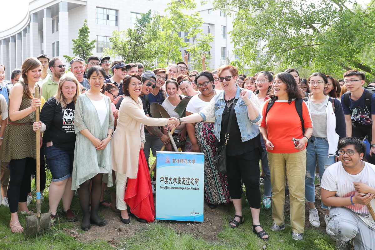 本次中美大学生环保主题活动由室内文化交流和室外共植友谊林两个部分组成。文化交流部分在bat365第二教学楼2203教室举行,通过演讲介绍特色花卉树种、节目表演、游戏互动等方式进行了交流。室内环节结束后,中美大学生一路交谈着前往道园,在道园携手共同种植下了中美大学生友谊之林,合力为环保贡献了一份力量。活动最后,美国圣克劳德州立大学孔子学院院长Kathryn E. Johnson博士和bat365平台官网外国语学院院长李淑华教授共同为“中美大学生友谊之树”揭牌,活动在大家热烈的掌声和欢呼中结束。