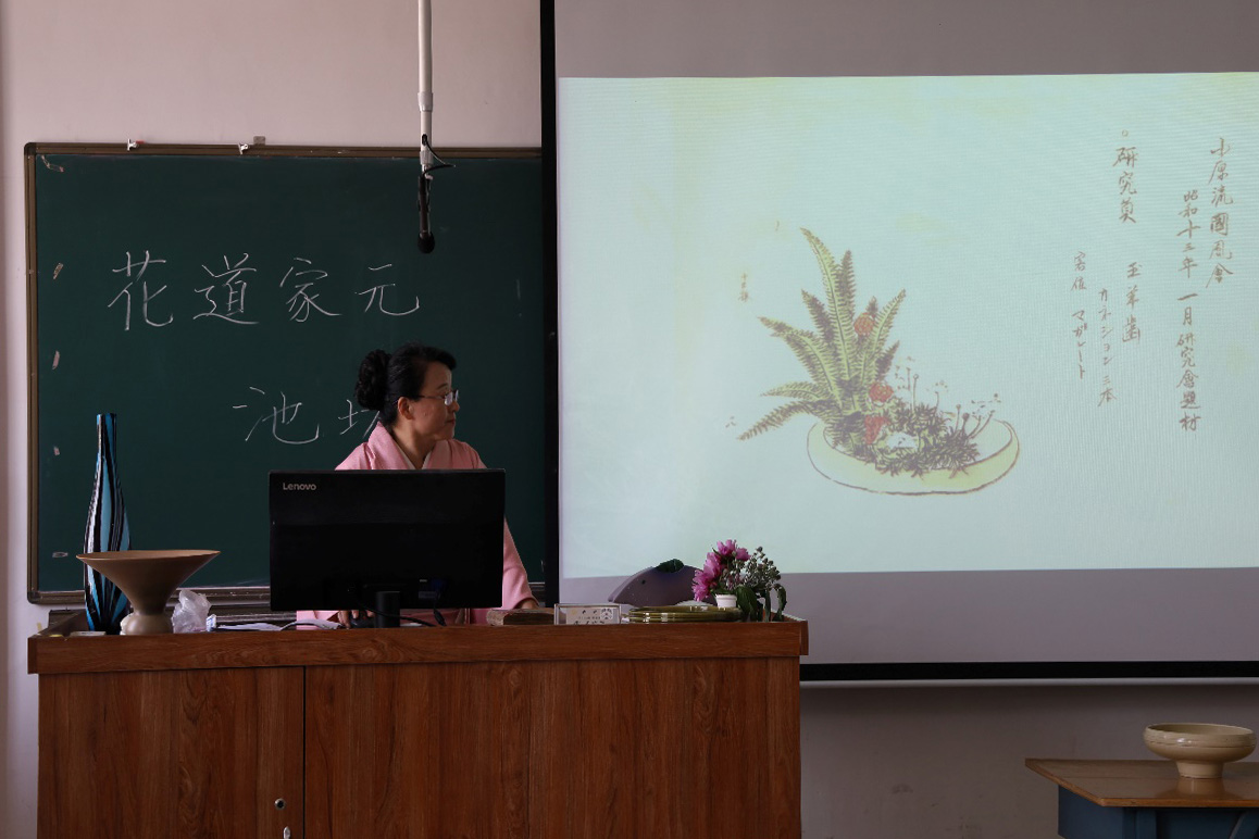 卫老师从日式插花的历史开始讲起,从隋唐初由中国传入后的蔚然成风,到如今众多派别的百家争鸣,卫老师引经据典,生动讲解,让同学们理清了日式插花的历史脉络和各个主要流派的基本特点。同时简单介绍了中日插花文化的历史渊源及主要特点。在谈及自己10多年的在日插花学习经历时,卫老师说即便不在国内,她也在不断学习与揣摩中国传统插花内涵,并将其融入于自己的作品及课堂之中,积极传承与传播中国传统插花文化。