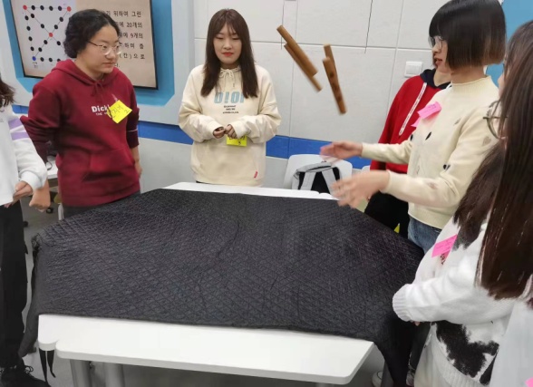 尤茨游戏(也叫“掷柶游戏”)是朝鲜三国时代以前流传下来的一项老少皆宜的传统民俗游戏,蕴含着祈愿丰收的美好愿望。本次活动旨在通过体验这一传统民宿游戏,使学生进一步深入理解韩国节日文化,加深对韩国传统文化的理解,进而激发了韩国语的学习热情。