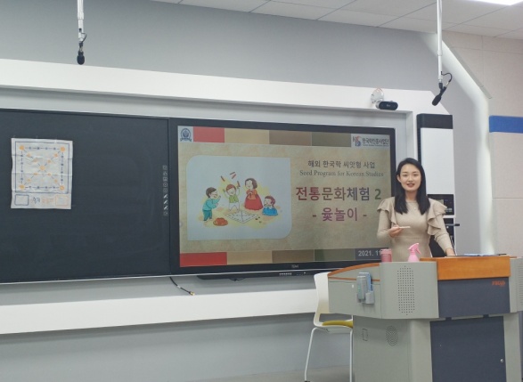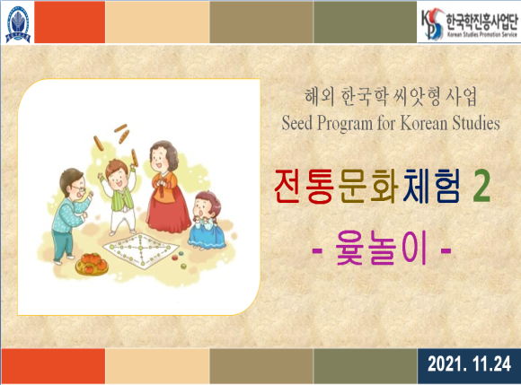 为进一步提高韩国语专业学生语言学习的积极性,同时作为契合韩国学研究项目中的多元化拓展体验要求,2021年11月24日,朝鲜语专业举办了传统文化体验活动之—尤茨游戏。朝鲜语系教师池美英及2019级朝鲜语系学生参与本次活动。
