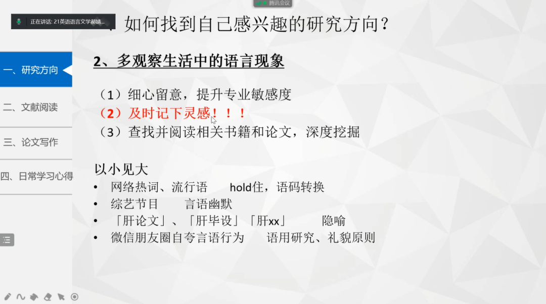 20级英语语言学方向李佳璐同学分享的主题为“教你写好毕业论文”。她从确定选题、查找材料、文档下载、阅读和整理材料、正式行文等方面讲解了学位论文撰写、行文框架和写作技巧,鼓励大家读研期间自主学习、惜时如金,做自己学术研究中的英雄。