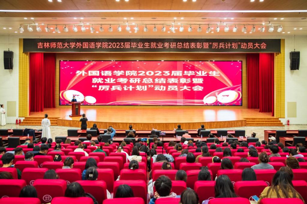 为深入贯彻党的二十大精神,积极落实“毕业生更充分更高质量就业”,充分调动2023届毕业生就业积极性,进一步做好2024届毕业生就业推进工作。4月27日晚,学院以线上线下相结合的形式在千人报告厅召开“2023届毕业生就业考研表彰暨‘厉兵计划’动员大会”。院长李淑华、党委书记韩强、副院长赵岩、李艳红、潘雁,党委副书记胡晶出席会议,英语系主任胡晓丽、俄语系主任王春红、日语系主任刘丽芳、教师第二支部书记许春花,团委书记范妙然、辅导员柳铭钰、陈健飞,2019级学生代表、2020级、2021级、2022级全体学生参加会议。会议由胡晶主持。