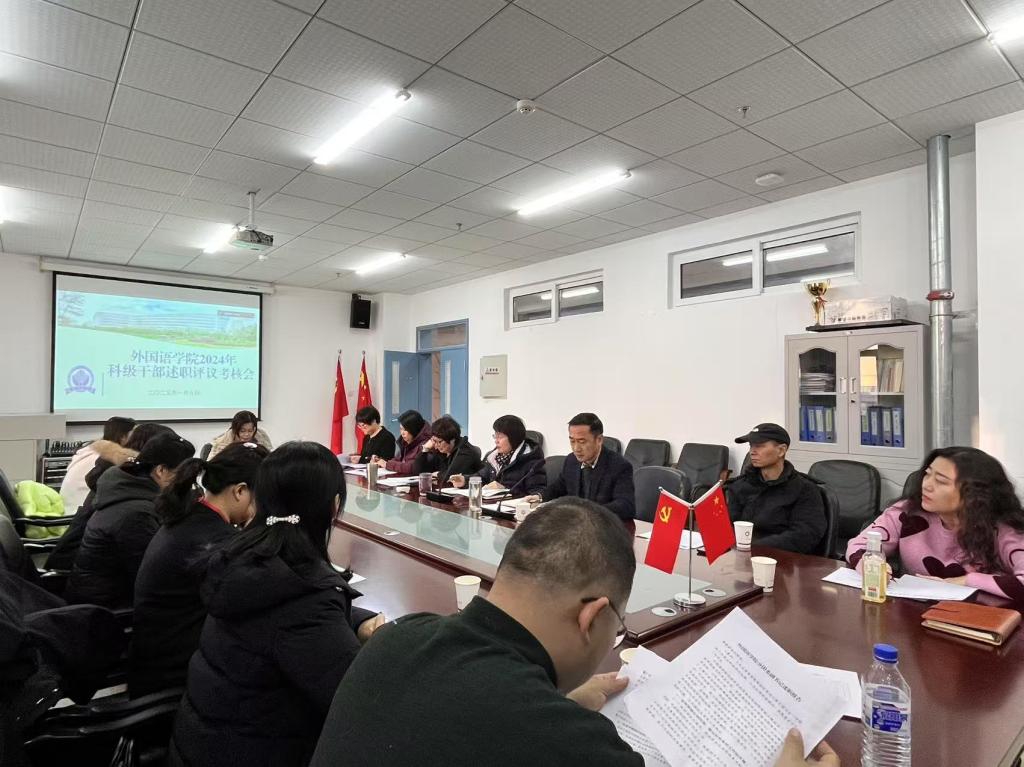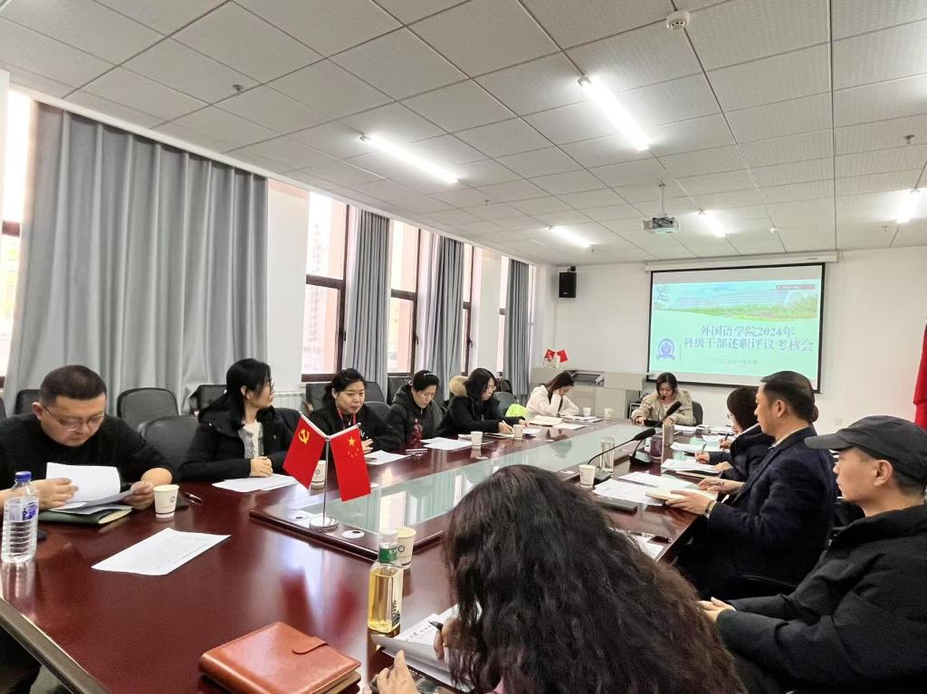 为加强科级干部队伍建设,考核学院科级干部2024年度现实表现和工作实绩。 1月6日下午,学院在双创2楼会议室召开外国语学院2024年科级干部述职评议会议。院长李淑华、党委书记韩强、副院长赵岩、李艳红、潘雁,党委副书记胡晶,党委委员、东北亚研究所副所长韩振宇出席会议。各专业系主任、办公室主任、学工办主任、各党支部书记、部分教师代表参加会议。四平、长春校区同步网络视频,会议由韩强主持。