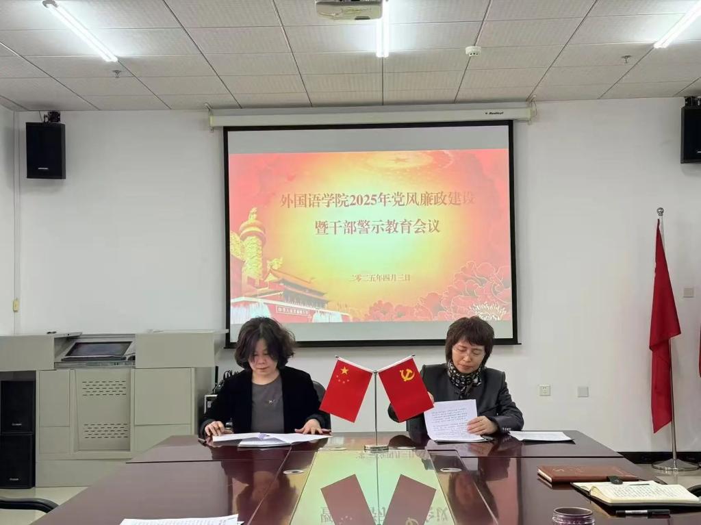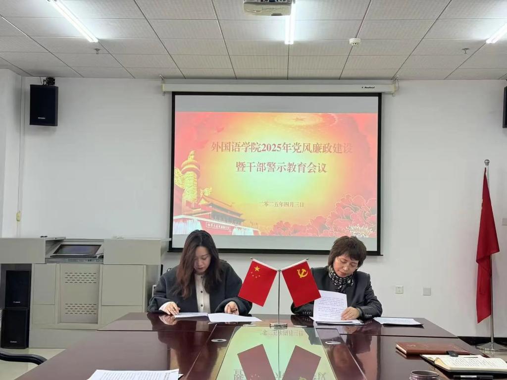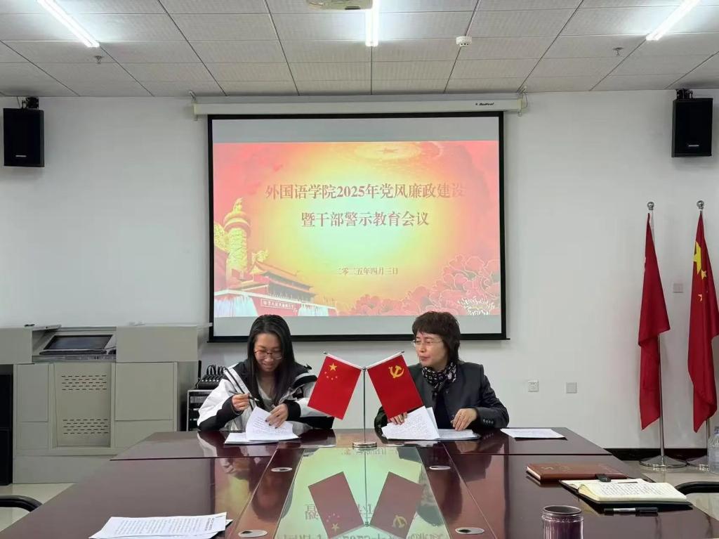 会前,与会人员集中参观了bat365平台官网廉洁自律教育基地。会上,李淑华同学工办、办公室、各专业签订《外国语学院教职工廉洁自律和师德师风承诺书》;赵岩传达了学校2025年党风廉政建设暨警示教育会议和干部勤政廉政集体谈心谈话会议精神及学校2025年纪检监察工作要点。