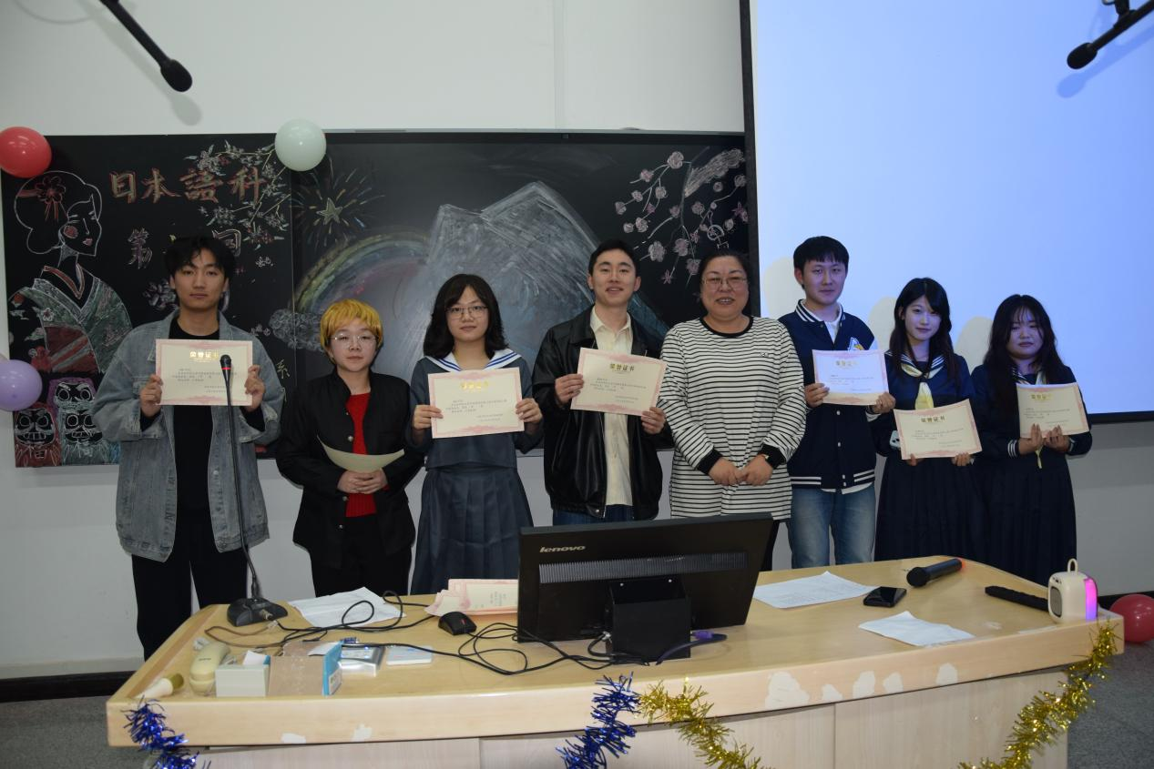 在所有小组完成表演后,由日语系的老师们为获奖小组颁发荣誉证书,现场掌声雷动,欢呼不断。随后,仓片老师代表评委发表总结讲话,对所有参赛同学的表现给予了高度评价,认为本届戏剧大赛无论是剧本内容、舞台表现,还是语言运用与团队配合,都展现了极高的水平与热情。