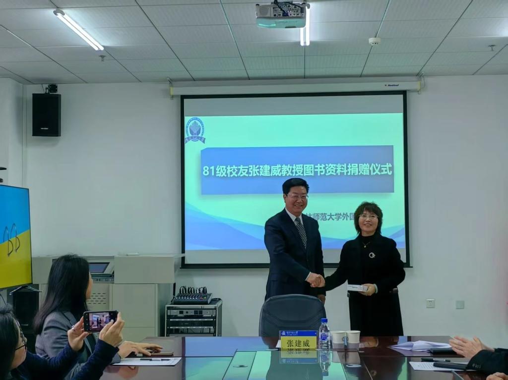 4月14日下午,学院在双创2楼会议室举行校友图书资料捐赠仪式,我院85届优秀校友、原大连市人民政府外事办公室二级巡视员张建威回母校,将自己收集的千余英文原版电子图书资料捐赠给学院。院长李淑华、党委书记韩强,副院长李艳红出席仪式,部分教师参加仪式。李淑华主持捐赠仪式。