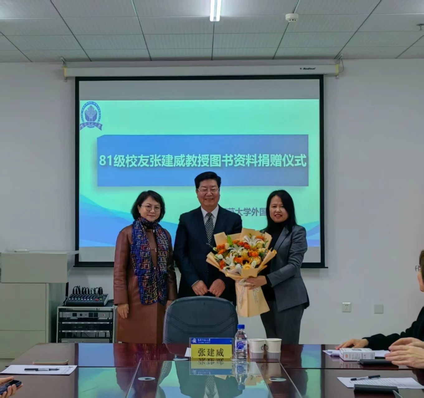 在捐赠仪式上,李淑华首先代表学院,对张建威来院讲学并捐赠表达了诚挚的欢迎与感谢,同时代表学院接受了张建威校友的捐赠。她指出,张建威作为本院的优秀校友,同时兼任学院英语翻译硕士校外行业导师,始终情牵母校,这份情怀与精神令人钦佩,值得大家学习。此次捐赠意义重大,将为师生的教学与科研工作提供有力支持,助力学院迈向高质量发展之路。
