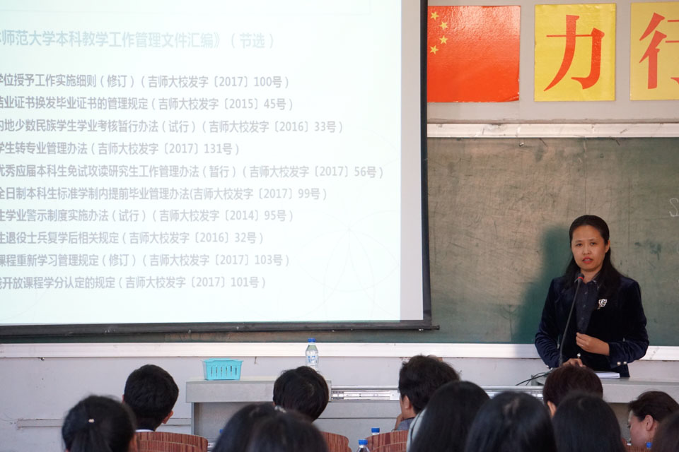 师生交流会上,与会教师精心准备了寄语送给新生,鼓励同学们努力学习,树立目标,争做优秀大学生;李艳红向学生详细介绍了英语专业的发展历程、专业特色、培养目标、课程设置、学业考试、学科赛事、就业方向等,并带领学生学习了相关教学管理文件。