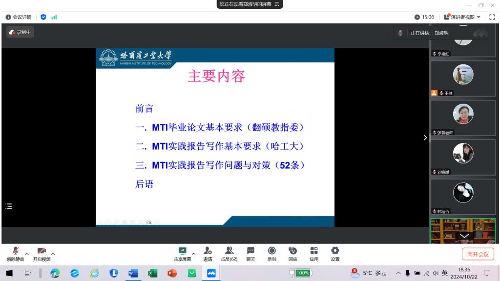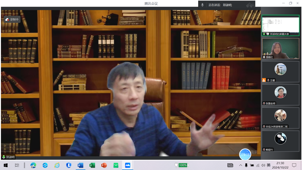 10月22日晚,语言文化沙龙通过腾讯视频方式举办了“MTI翻译实践报告写作:问题与对策”学术讲座,本次讲座邀请哈尔滨工业大学外国语学院硕士生导师、翻译教学与研究中心主任郑淑明副教授主讲。学院翻译硕士专业全体师生参会聆听,讲座由副院长李艳红主持。