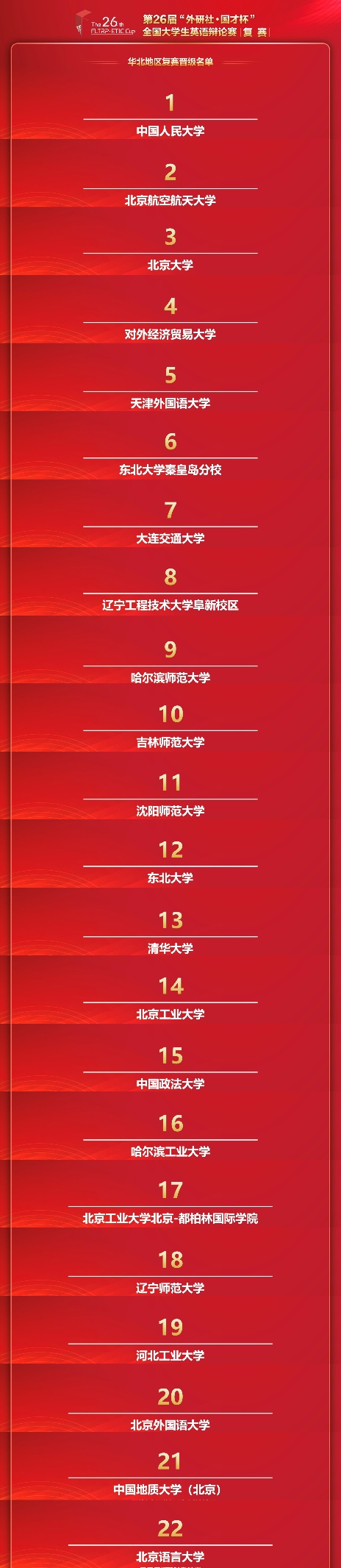 “外研社·国才杯”全国大学生英语辩论赛是一项高规格、大规模的权威赛事活动,自1997年创办以来坚持以赛促教、以赛促学、学赛结合,帮助学生开拓国际视野、强化学习意识、提升英语表达和思辨能力,为国家培养家国情怀与国际视野兼备的国际化人才。该项赛事由北京外国语大学、外语教学与研究出版社、北京外国语大学中国外语测评中心和北京外研在线数字科技有限公司主办,已连续被纳入教育部高等教育学会发布的“中国高校创新人才培养暨学科竞赛排行榜”。