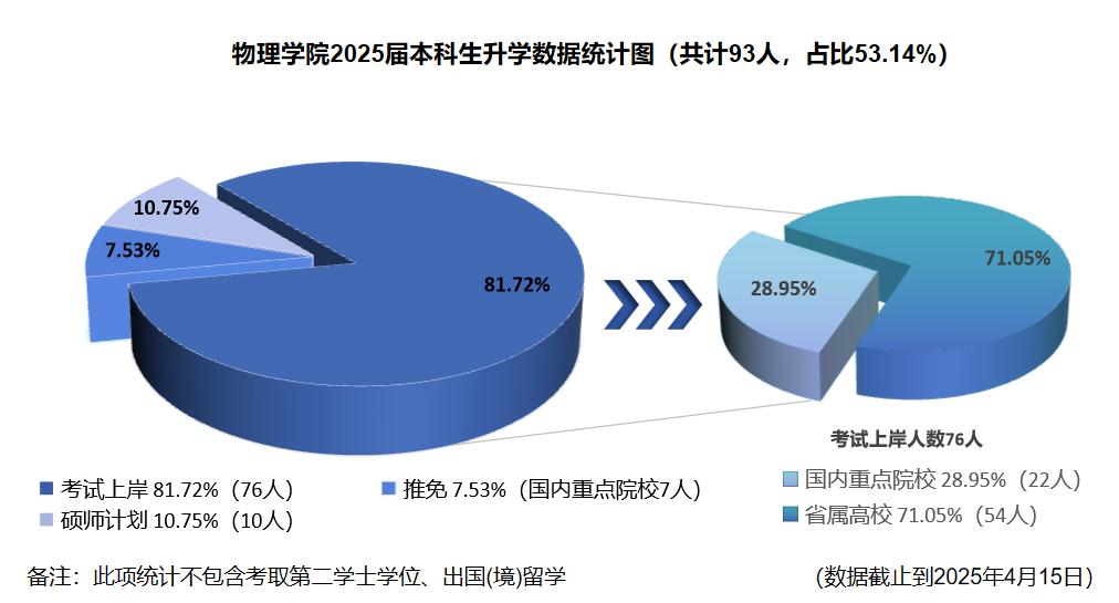研途璀璨星辉耀,金榜题名展宏图。物理学院2025届本科毕业生175人,93人录取为硕士研究生,升学率为53.14%,较2024年提升了6.32个百分点,升学率稳步上升。其中,考取南开大学、厦门大学、吉林大学、东北大学、北京理工大学和陕西师范大学等国内重点院校29人,占31.18%,考研质量显著提升。优异成绩的取得,既是莘莘学子努力拼搏和不懈奋斗的结果,也是学院不断提高教学质量、注重学风建设的优秀成果展现。