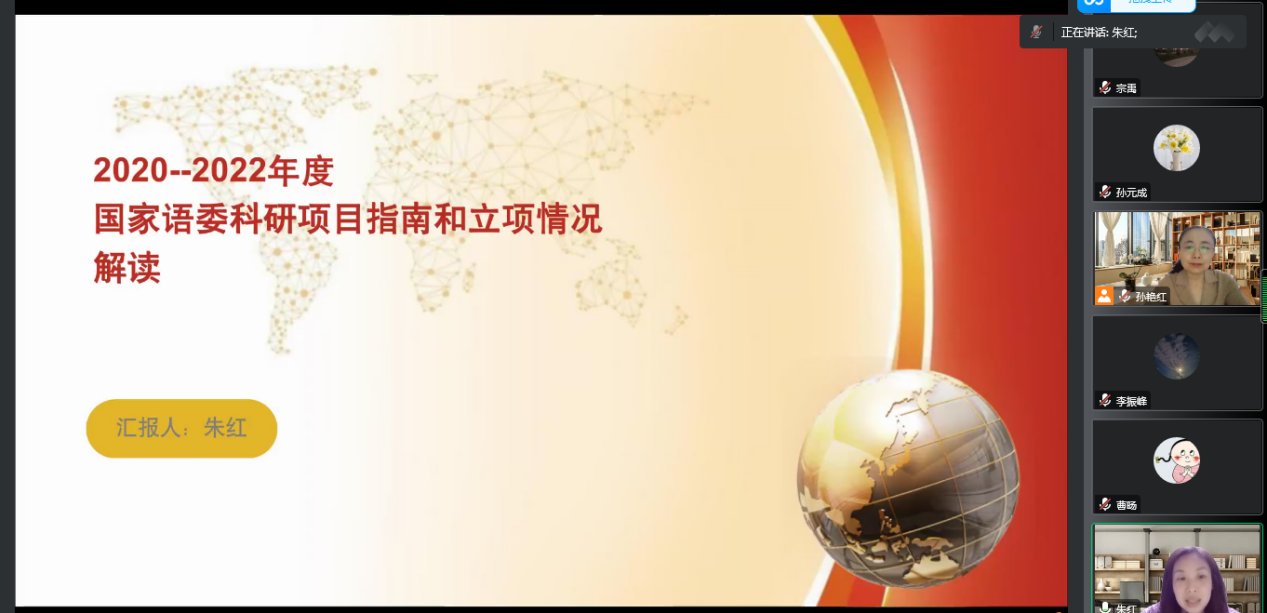 孙艳红教授简单介绍了文学院、职业技能教研部本年度的项目申报情况后。孙元成、孙本成、曹旸旸、朱红、周天甲、赵海宝等教师结合本年度自身科研项目立项情况,分别对近几年来国家社科基金语言学方向课题申报情况、立项情况;教育部人文社科项目语言学立项情况、国家语委科研项目指南和立项情况、国际中文教育项目指南和立项情况、教育部国家语委《关于加强高等学校服务国家通用语言文字高质量推广普及的若干意见》进行了解读。李佳老师结合自己申报项目历程,谈了自己立项教育部人文社会科学研究项目的成功经验。陈薇与赫天娇老师和与会人员交流自己申报并获批教育部语合中心项目的经验。各位老师畅所欲言,会议气氛十分热烈。