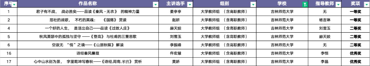 在第六届中华经典诵写讲大赛吉林省赛区“诗教中国”诗词讲解大赛中,我院师生取得了优异的成绩。在全省各高校中,我院师生参赛数量多,获奖人数多,表现突出。据统计,本次大赛吉林省赛区共收到大学教师组和大学生组作品305件,获得优秀奖以上的大学教师组作品18件,我院教师有7件,占比38.9%;获得优秀奖以上的大学生组作品共85件,我院学生有27件,占比31.8%。获得三等奖以上作品推荐参加国赛。其中推送国赛的大学教师组作品共12件,我院教师有5件;推送国赛的大学生组作品共59件,我院学生有17件。本次比赛共有10位教师指导的学生参赛作品获奖。