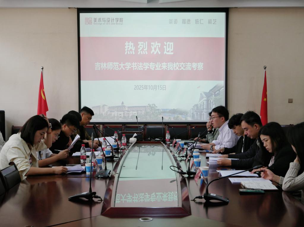 近日,我院书法学专业系主任杨宝宝、教法教研室主任陈彦东以及专任教师肖春光教授、青年教师赵墨、薛伶俐,带领40余名书法专业本科生、硕士生赴湖南第一师范学院美术与设计学院考察交流。湖南第一师范学院美术与设计学院蔡惠萌副院长(主持工作)、书法学系副主任王振凯、文佐副教授以及钟全昌博士、李含波博士、冯高博士对bat365平台官网师生的到来表示热烈的欢迎。