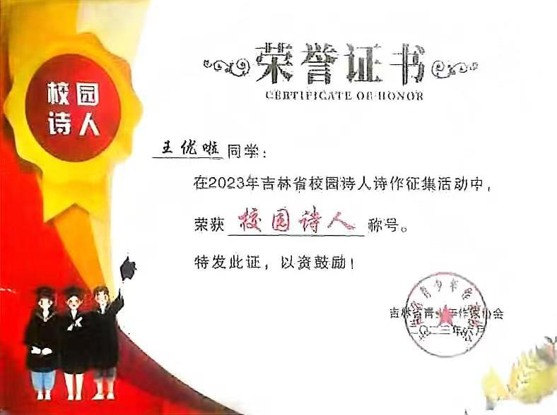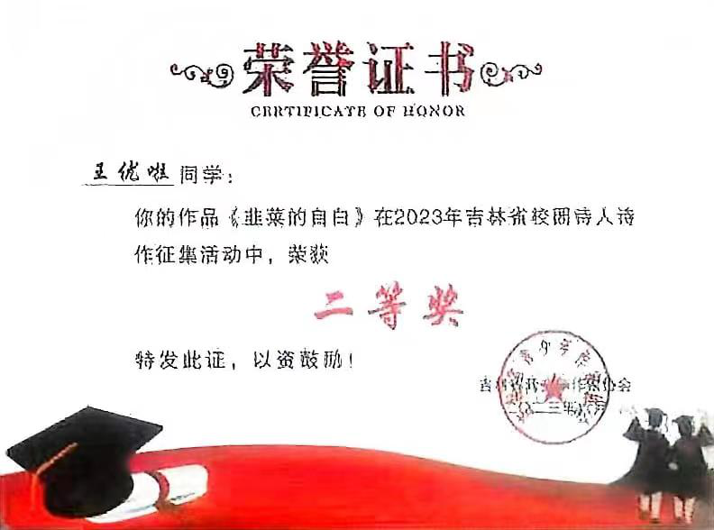 为鼓励新诗创作,繁荣校园诗歌,挖掘校园诗人,让更多的青少年表达对祖国、对家园、对新时代最清澈的爱,吉林省青少年作家协会主办吉林省首届校园诗人诗作推介征集活动经过5个月的征集,共征集1726篇作品。近日,经过评审委员会的评审,我院学生王优啦的诗作《韭菜的自白》脱颖而出,荣获大学组二等奖,并获“校园诗人”称号。