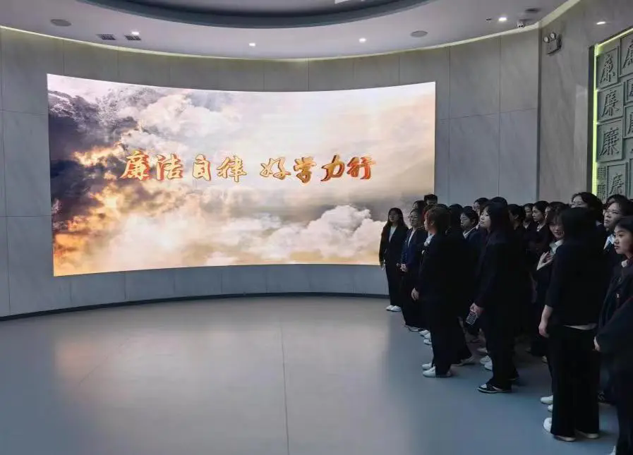 在敬·铸魂立心”展厅内,全体党员在讲解中主要学习了党的百年纪律建设史,学习关于廉洁自律的政策方针。在“净·德行润心”展厅内,全体党员更加深入地理解了廉洁自律在德与法两个方面的双重体现,有利于学生党员们自觉加强自身修养和良好品德的培养。在“镜·歧路警心”展厅内,全体学生党员在警示体验区沉浸式感受到触犯红线的“惊涛骇浪”。随后,大家依次走过警钟门,为自己敲响警钟。在“境·吉师涤心”展厅内,全体学生党员观看了“清廉上河图”。党员学生刘策同学发表学习感想,讲述自己参观廉洁自律教育基地后的心得体会,今后要在学习生活中培养艰苦奋斗精神,注重树立廉洁理念、向廉洁的高尚榜样学习。