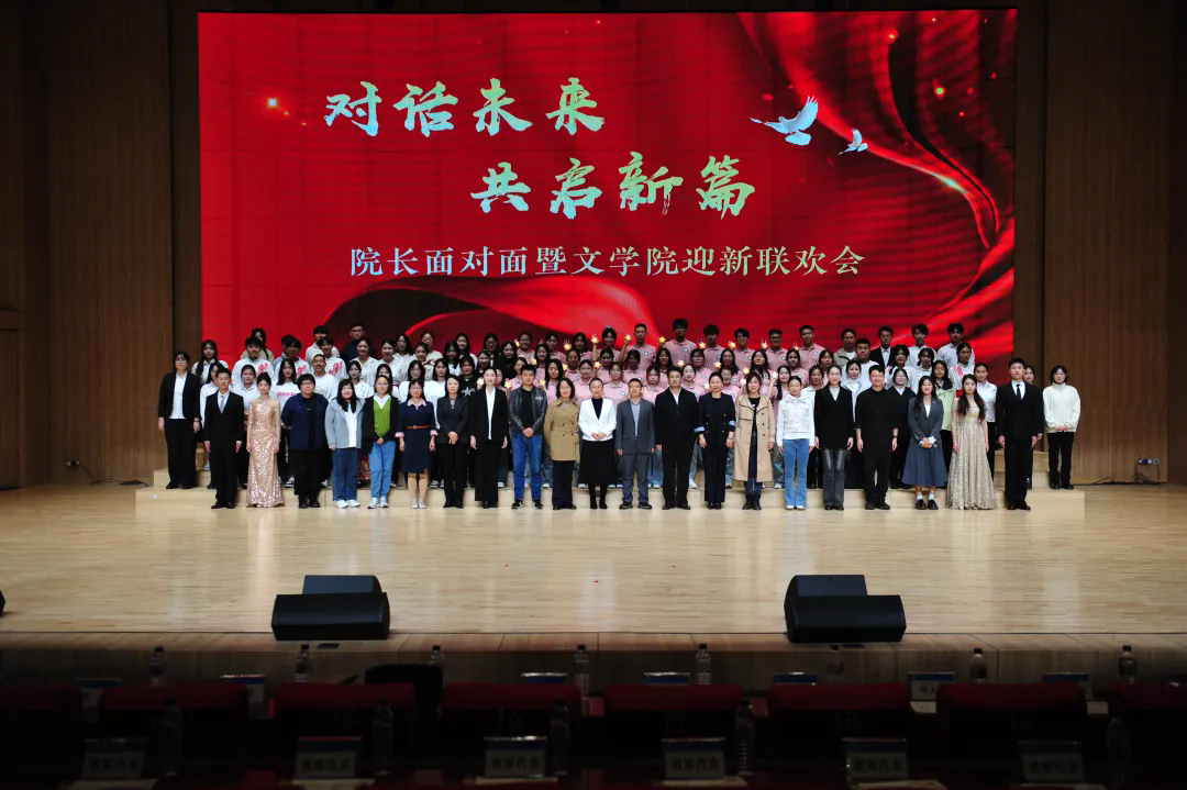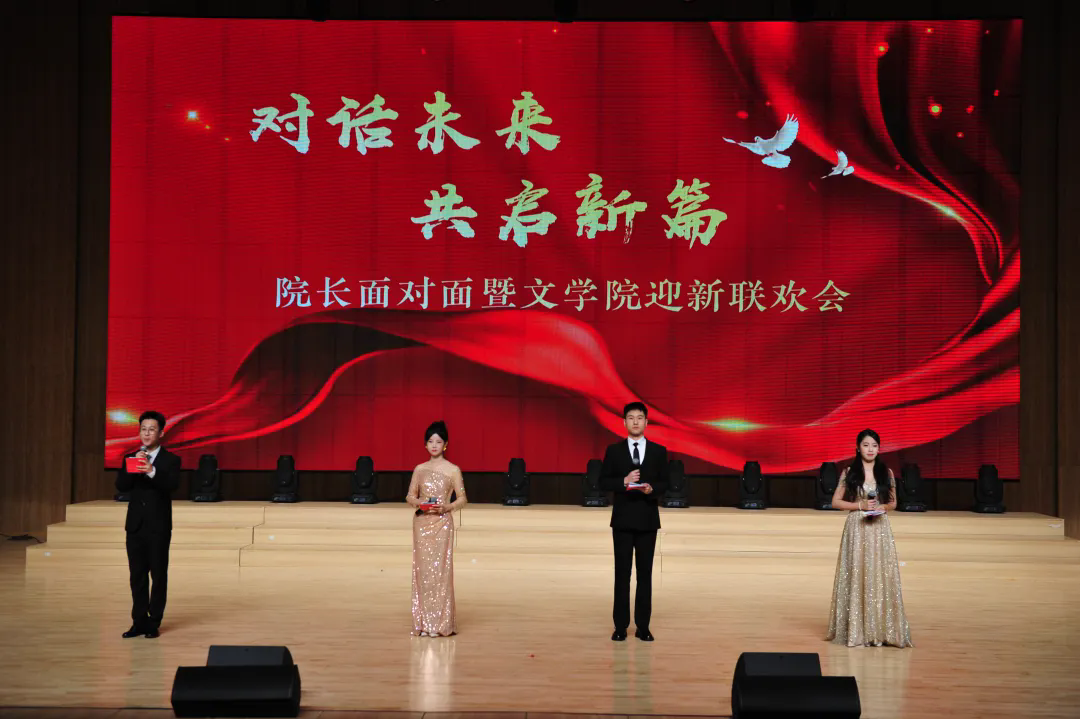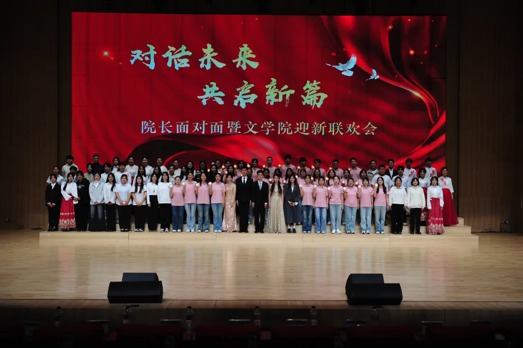 金秋送爽迎新秀,文脉赓续谱新章。为展现深厚人文底蕴与昂扬精神风貌,帮助新生融入文学院大家庭,我院于2025年10月11日14时在音乐厅成功举办“对话未来·共启新篇”——院长面对面暨迎新联欢会。文学院全体教师及2025级新生齐聚一堂。本次迎新联欢会由周佩祺、管卿、王钦和鲁俊龙主持。
