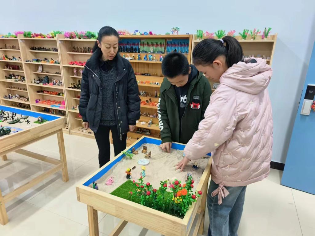 他们在心理老师的带领下体验了沙盘主题活动及心理设备。在沙盘的世界里,他们用手中的小物件构建出属于自己的小天地。通过这些具象化的表达,学生的内心世界得以显现,孩子们的内心在沙游中逐渐疗愈,形成了积极、平和的自我特质。奇妙的沙盘活动结束了,同学们带着意犹未尽的心情,怀着满心期待,期待后续的沙盘之旅。