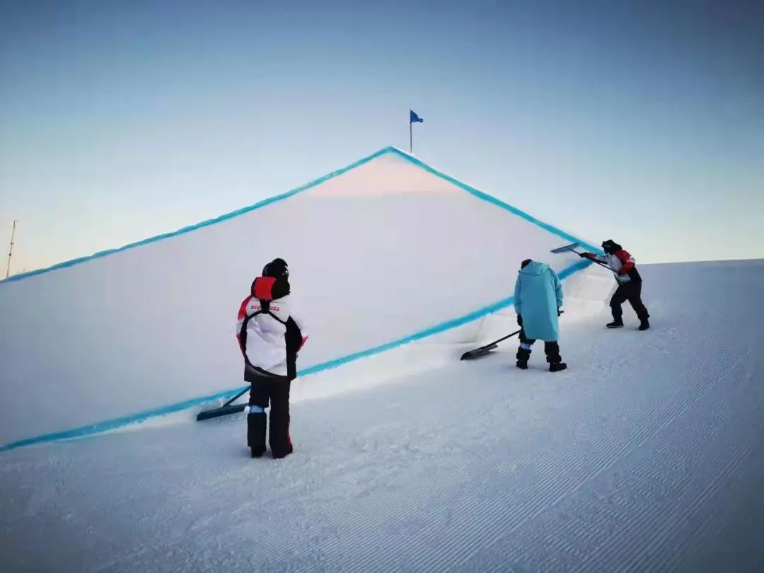 A:在此次备赛工作中,我觉得最大的困难是塑形和修整跳台,公开训练和正式比赛之间只有15分钟的时间,这15分钟要完成赛道整平、清除余雪、塑形完整,并达到比赛要求。在最短的时间限制内要达到最完美的标准,虽然在赛前也经过不断培训和模拟训练,但都是不计时的,正式比赛时候有太多意外和突发情况产生,却仅有15分钟。知道难点在哪里之后,我通过赛前、赛中与世界顶级德国塑形团队学习,交流经验,总结方法,自己琢磨,掌握了其中精髓,掌握了好的方法和操作顺序,不断的练习,最后能够在12分钟之内完成修复,并将余雪变成面条雪,动作一气呵成。这12分钟,不仅挑战团队的协作能力,还考验每个人的耐力,因为塑形铲本身的自重就达到了3—4公斤,还要不停的工作。还有一次,挑战性极大,赛前下了暴雪,所有人员顶雪工作。印象最深的一次我们连续不停的干了4个小时,最后保证了运动员顺利训练。
