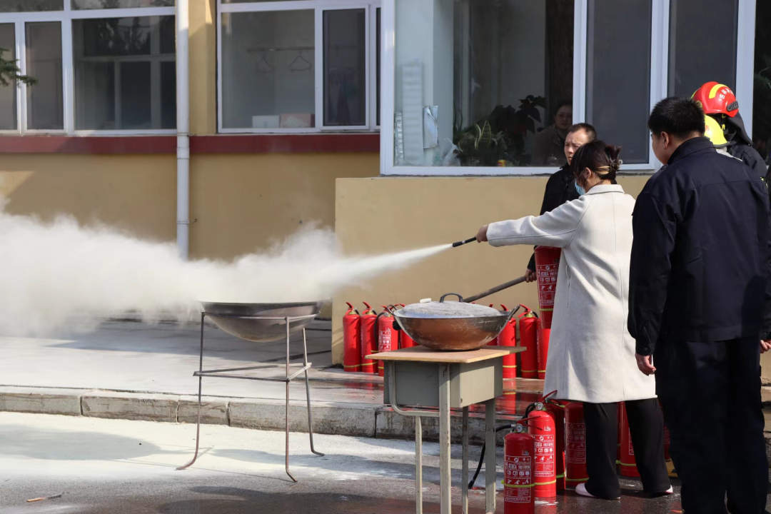 消防员指导同学们练习使用灭火器,有了充分的消防经验,在面对火情的时候才不会慌乱。