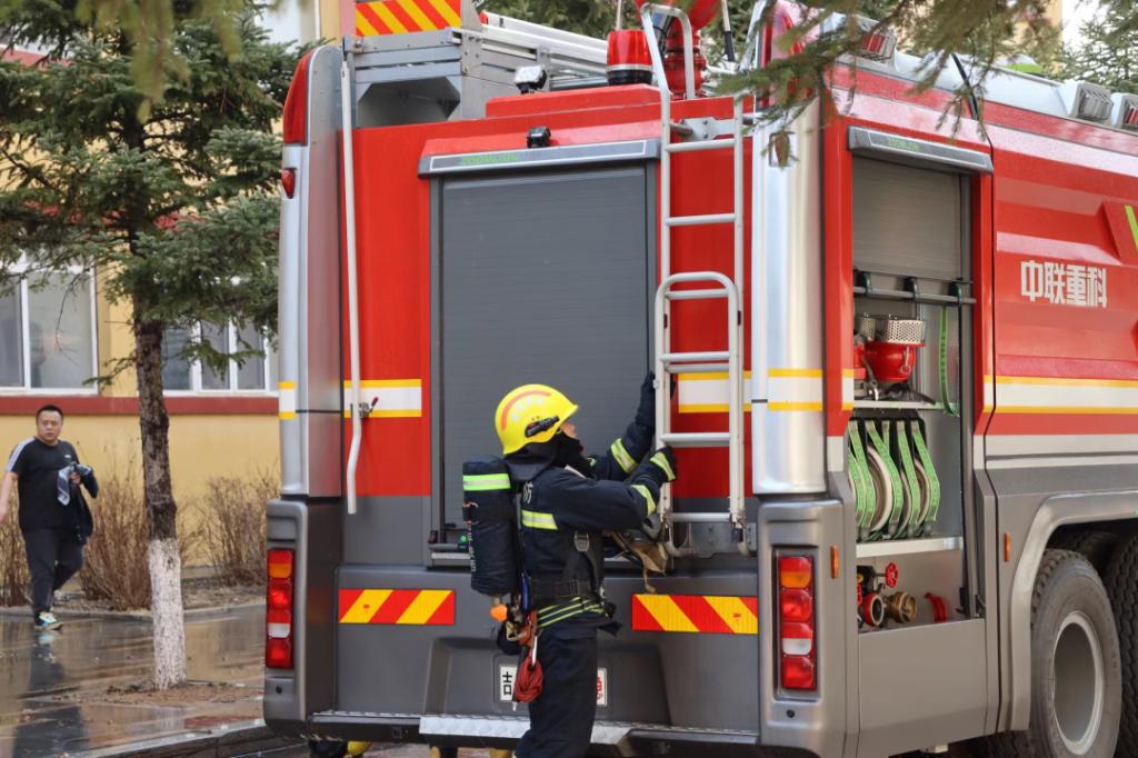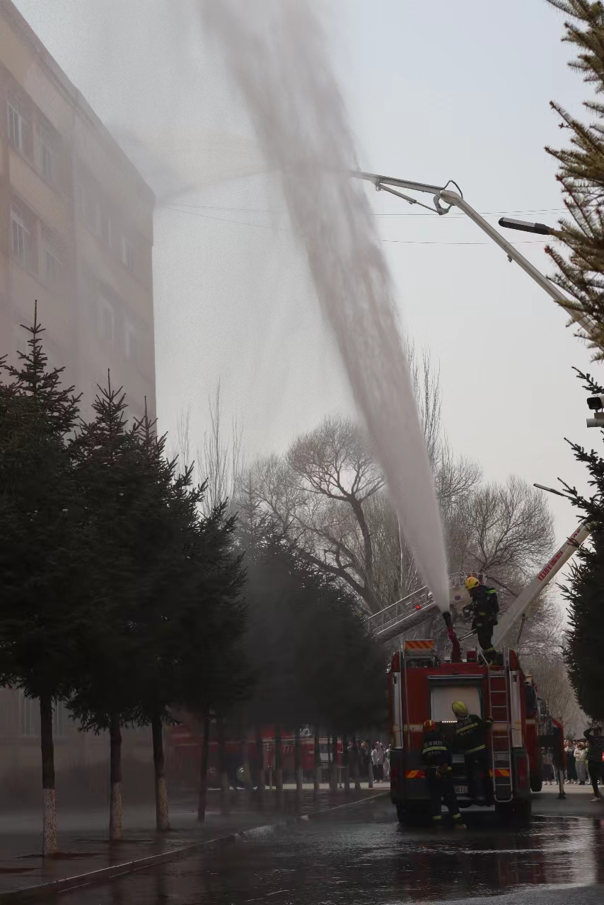 消防车成功抵达校园,准备开始演练。