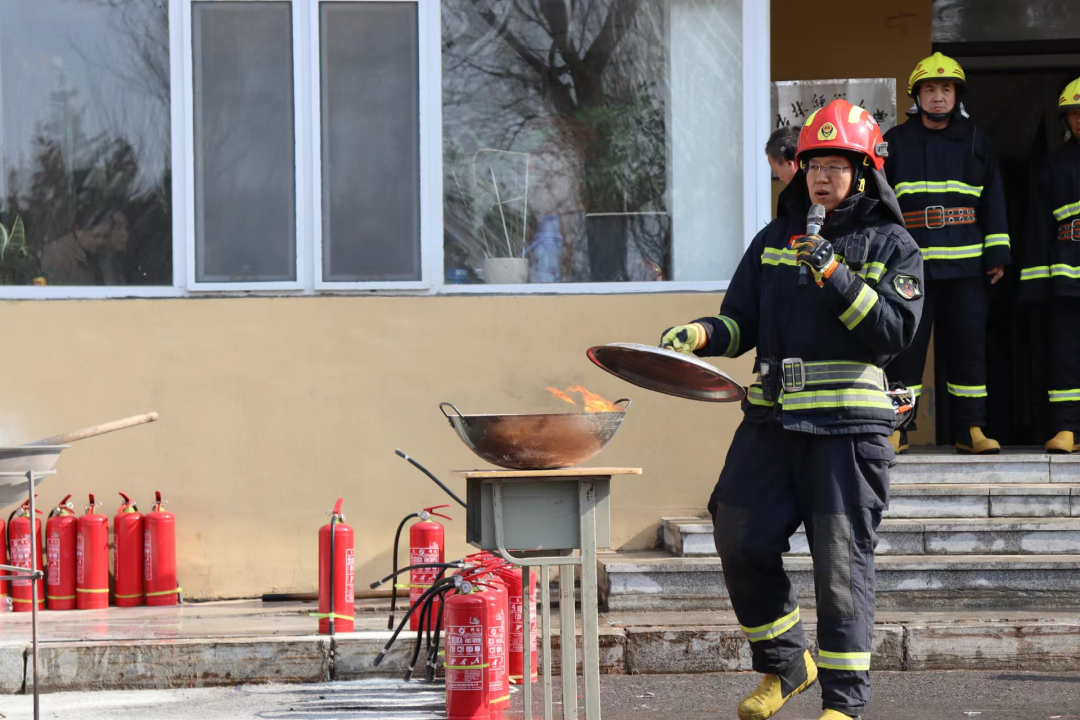 同学们观看消防员的灭火演示,消防员动作娴熟地拿起灭火器,拉开保险销,对准火焰进行喷射,火焰迅速熄灭,动作干练。