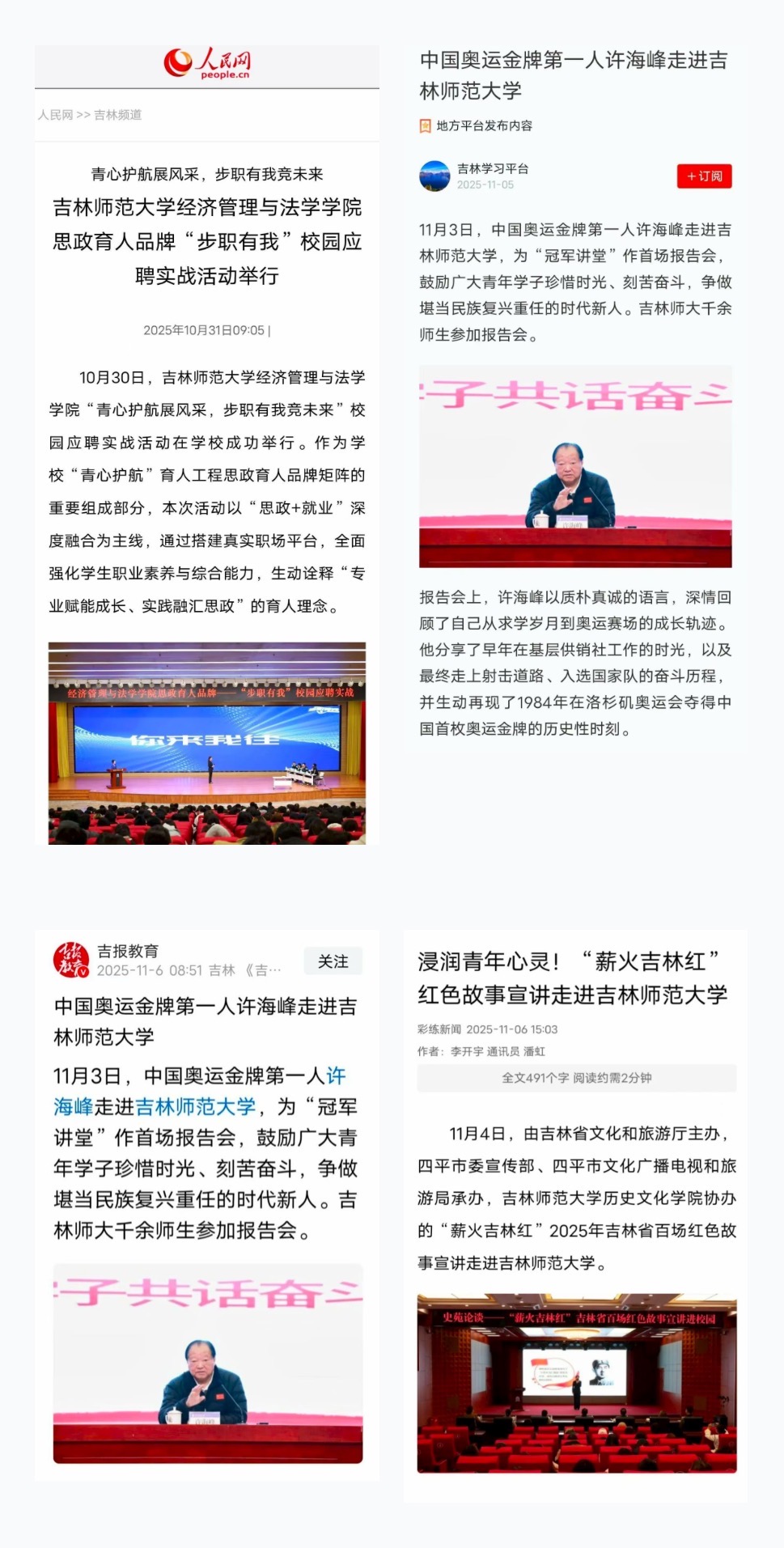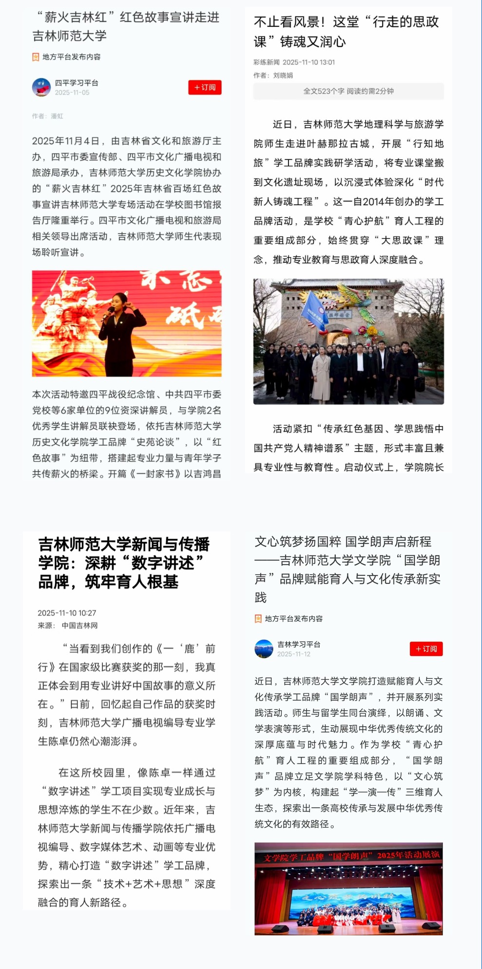 报道围绕“青心护航”育人工程的系统化设计与品牌化推进,聚焦在思政引领、文化浸润、心理关怀与职业发展等维度的创新举措。学校抢抓育人先机、前置育人场域,系统打造浸润式迎新服务体系,强化入学教育的价值引导与情感认同培育。通过“冠军讲堂”首场报告、“薪火吉林红”红色宣讲等品牌项目,实现理想信念教育、红色文化传承与专业教育的深度融合,显著增强了思想政治教育的感染力与实效性。在学工品牌构建上,经济管理与法学学院“步职有我”、地理科学与旅游学院“行知地旅”、新闻与传播学院“数字讲述”、文学院“国学朗声”等特色育人品牌协同推进,推动思政工作与学科建设、教学科研、学生发展需求深度对接,实现从知识传授到人格塑造的育人升华。努力打造具有吉师特色、彰显吉林担当、体现时代要求的学工品牌矩阵,为培养推动吉林高质量发展明显进位、担当民族复兴大任的时代新人提供坚实支撑。