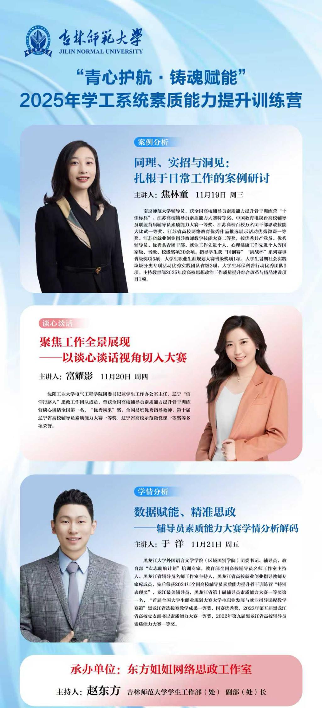 11月19日至21日,bat365举办“青心护航·铸魂赋能”2025年学工系统素质能力提升训练营(第二期)。本次培训由学生工作处主办、东方姐姐网络思政工作室承办,全校辅导员通过线上平台全程参与学习。