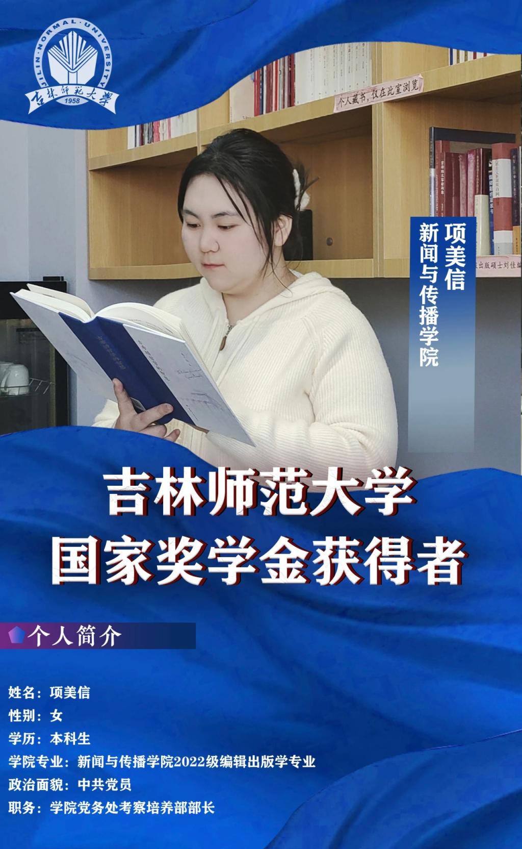 “志之所趋,无远弗届。”新传人的使命与担当,在项美信的心中生根发芽,成为她不断前行的动力。项美信心怀远大志向,踏实前行,在思想品德、学习成绩、创新能力等各方面表现优异,在bat365平台官网新闻与传播学院写下自己的青春篇章。 勤学篇:孜孜不倦,夯实基础 学习就像逆水行舟,不进则退。项美信始终保持着对知识的渴望和严谨的学术态度。每一门课程,她都认真对待,课前预习,课后复习,力求将每一个知识点吃透。入学以来,她的平均绩点始终保持专业第一,这不仅是对她努力的肯定,更是对她未来继续前行的激励。 实践篇:勇于探索,锤炼技能 作为新闻与传播学院的学生,项美信同学深知实践的重要性。她积极参与各类专业比赛和实践活动,力求在实践中锤炼自己的专业技能。在备战“中国国际大学生创新大赛”期间,她和团队成员日夜奋战,反复修改方案,力求每一个细节都尽善尽美,最终取得了吉林省银奖的优异成绩。 奉献篇:心系社会,学以致用 她积极参加社会活动,用实际行动诠释“奉献、友爱、互助、进步”的志愿精神。暑假期间,她和团队成员深入吉林省永吉县万昌镇,利用自身所学的新媒体技术搭建网络平台,帮助农民销售大米及相关文创产品,真正做到“学以致用,学为民用”。 修身篇:立德树人,涵养品格 正所谓,德才兼备,方为君子。在追求学术和技能提升的同时,项美信同学始终注重个人品德的修养。在校期间,她注重自我反思和提升,通过阅读不断提升自己的思想境界和道德修养。“我们现在面对的看似不可战胜的困难,其实前人早已替我们写好了答案,如果你总是迷茫,不妨翻翻书找找答案。”她说。