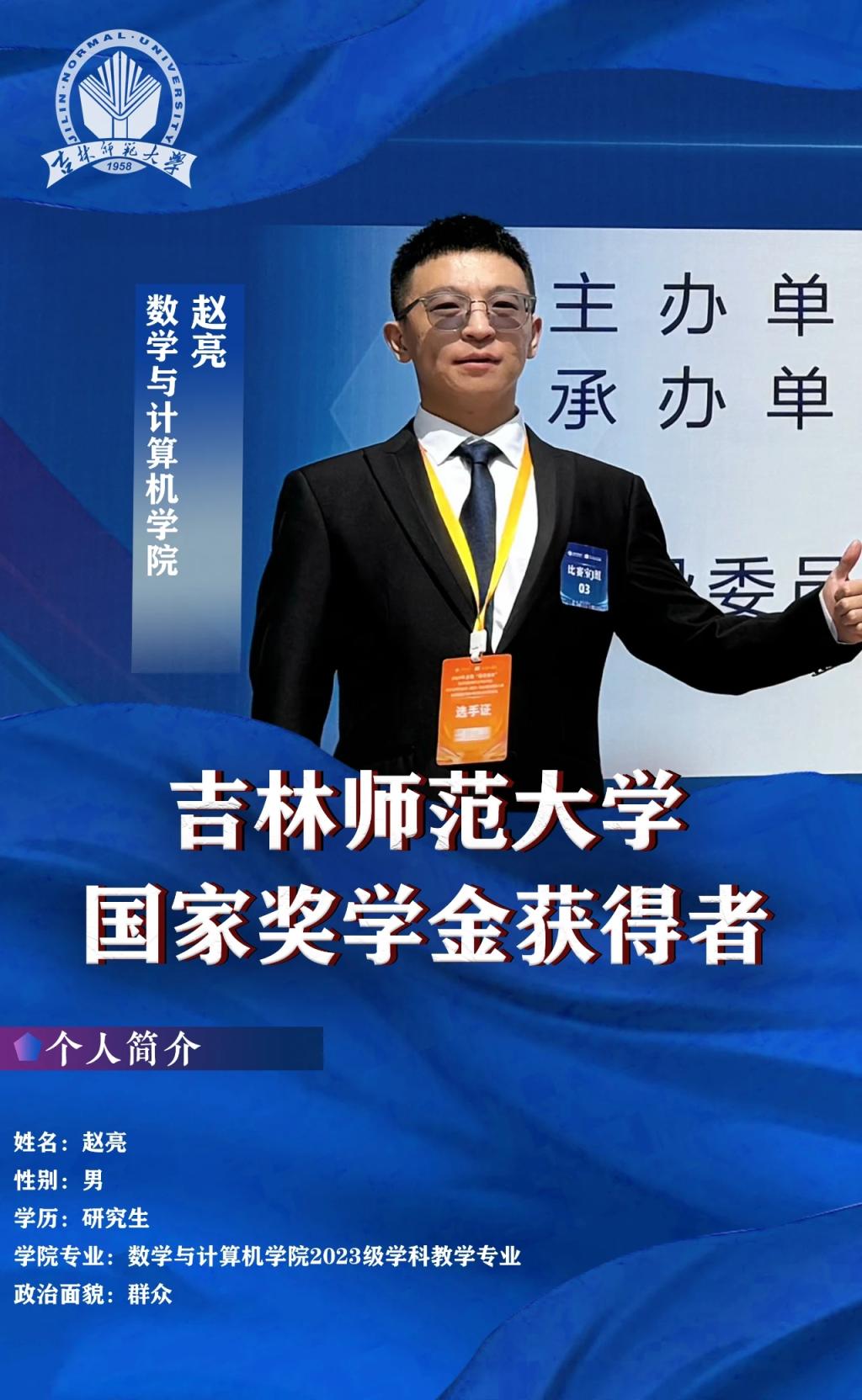 在学业上,赵亮一丝不苟,刻苦学习,绩点为3.89,专业排名第二。他积极参加科研工作,基于“跨学科”视角探究数学教学新模式,创新设计“I-5E”跨学科教学模型,公开发表与专业相关的省级期刊论文4篇。